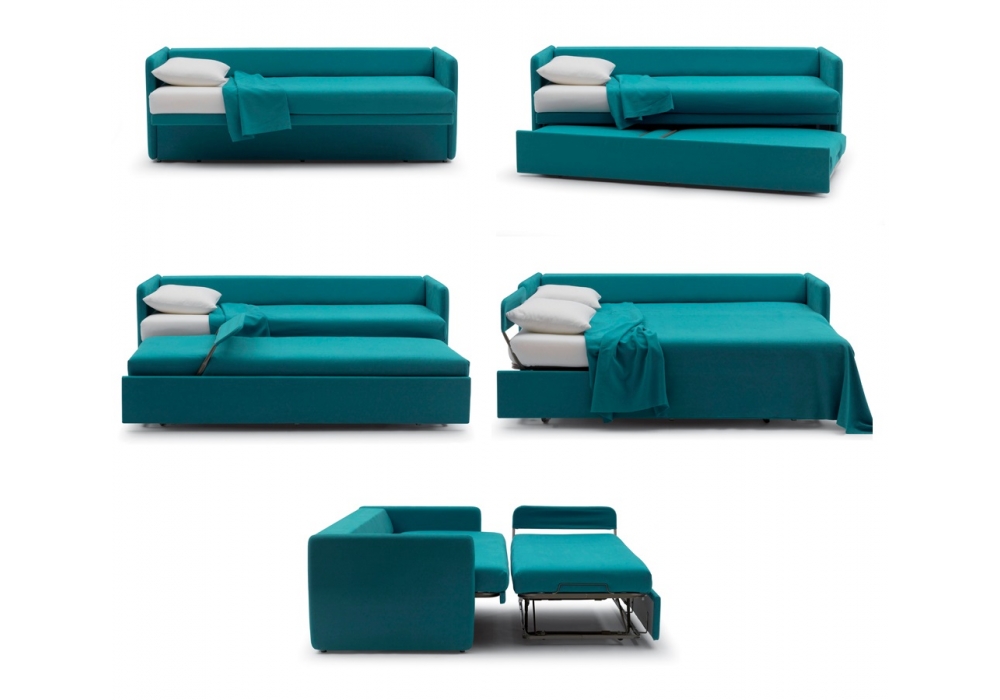 Olo diseñado por Campeggi es un sofà-cama con acolchado en espuma de poliuretano y revestimiento completamente desmontable. Somier realizado en madera de haya estratificada y colchón disponible en poliuretano, látex natural o con muelles. Cojines decorativos no incluidos.