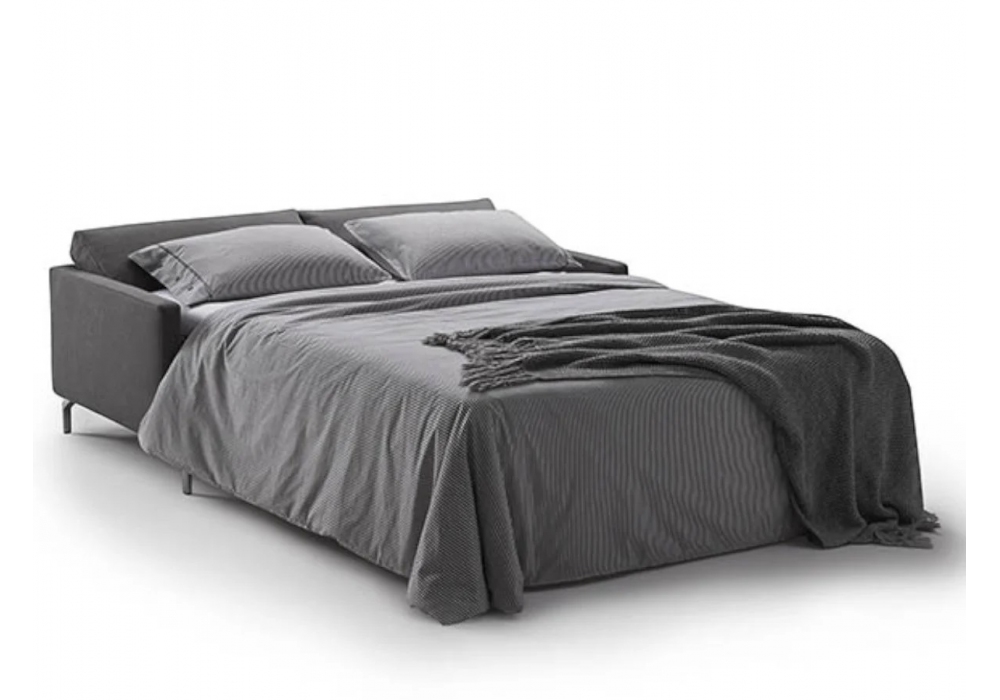 Dave diseñado por Milano Bedding es un sofá cama tapizado en tejido, perfecto para unir funcionalidad y elegancia en una sola solución. Este sofá cama se distingue por su mecanismo Lampolet, que facilita su transformación. La estructura del sofá cama Dave es delgada y resistente, destacada por sus patas de 16 cm de altura, disponibles en aluminio pulido o níquel negro, que contribuyen a perfeccionar su línea. Par de cojines lumbares incluidos. Colchón incluido.