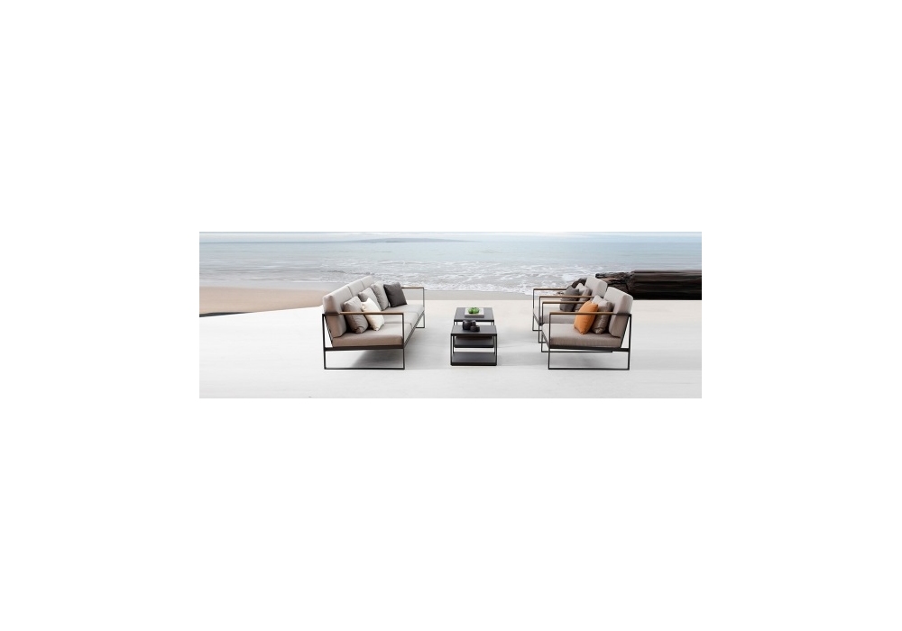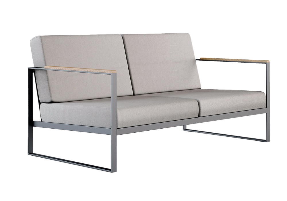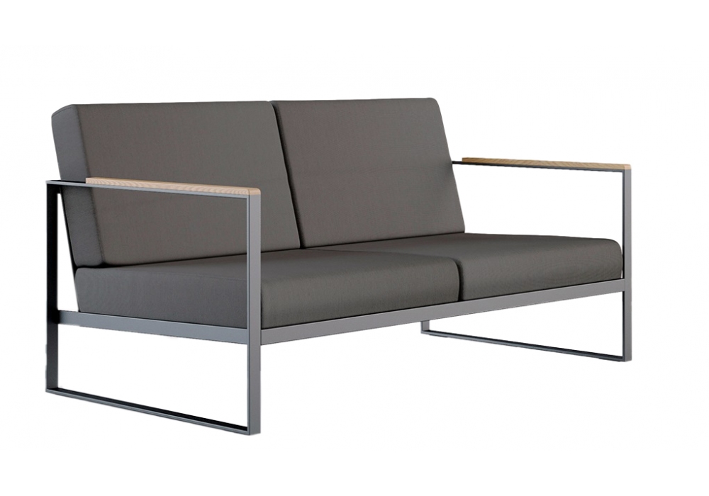 Garden Easy Sofa diseñado por Broberg & Ridderstråle para Röshults es un sofá de dos o tres plazas con estructura en acero inoxidable antracita y teca. Cojines de asiento y respaldo confeccionados en tela Sunbrella® resistente a la intemperie disponible en diferentes tapizados.