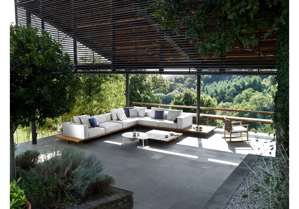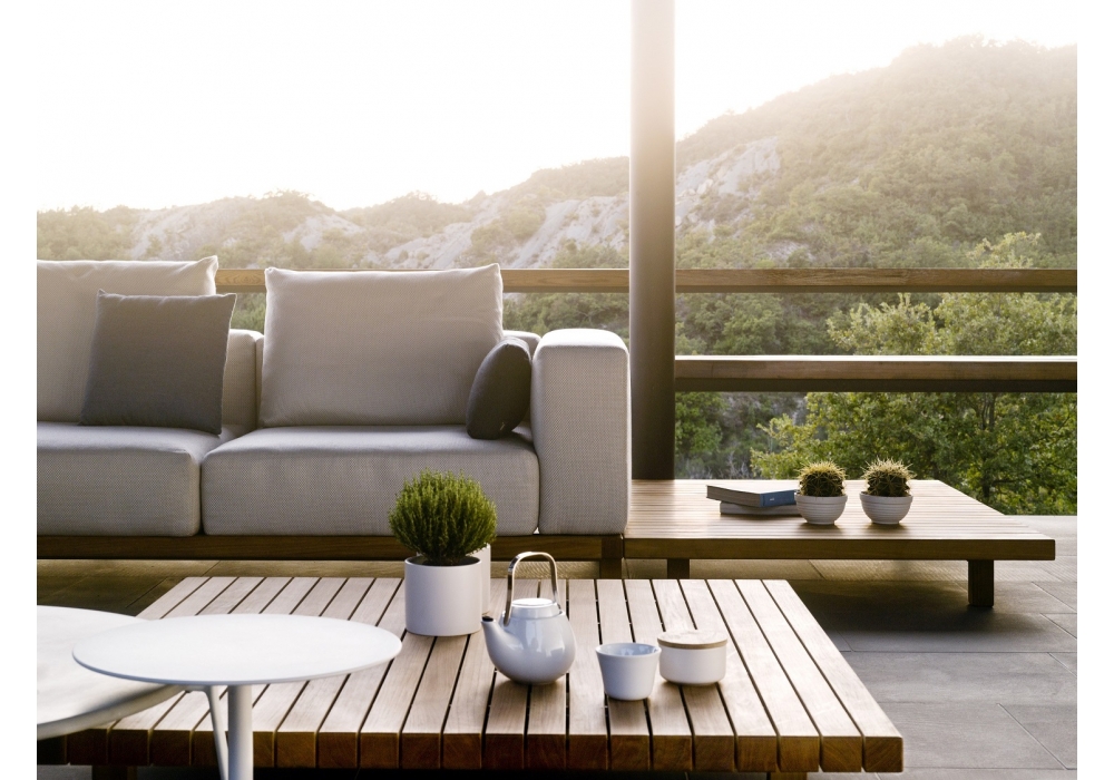 Vis à Vis diseñado por Piergiorgio Cazzaniga para Tribù es un sofá de teca. Este sofá está disponible en configuración diferente. Tapicería en tela para uso al aire libre.
