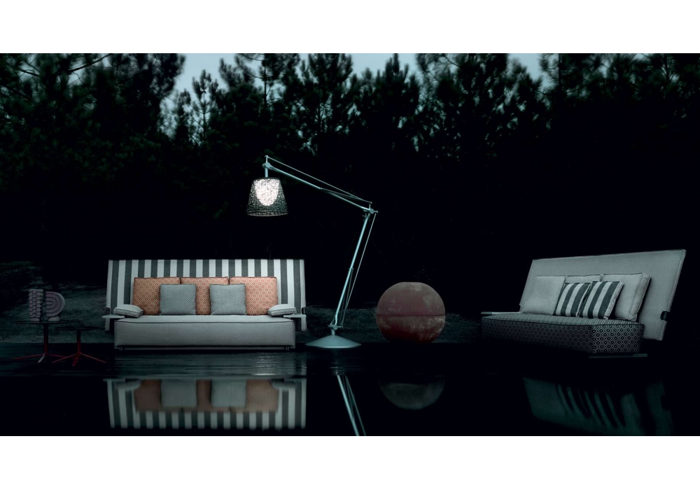 Oh, it rains! diseñado por Philippe Starck para B&B Italia Outdoor es un sofá de exterior con estructura de aluminio con acabado bronce, bisagras de aluminio anodizado en gris cálido. Tapicería en diferentes tejidos.