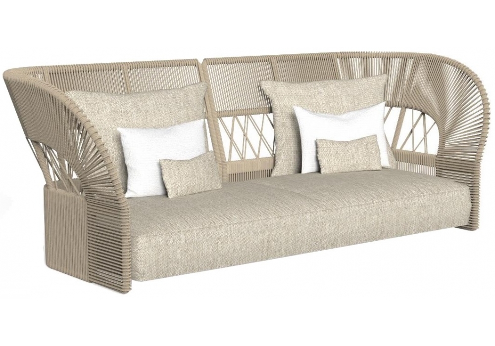 Cliff Dèco diseñado por Ludovica y Roberto Palomba para Talenti es un sofá con respaldo de cuerda. Los detalles están hechos de aluminio cubierto con cuerda náutica tejida en diferentes acabados, el asiento de tela en los diferentes acabados de la colección Cliff.