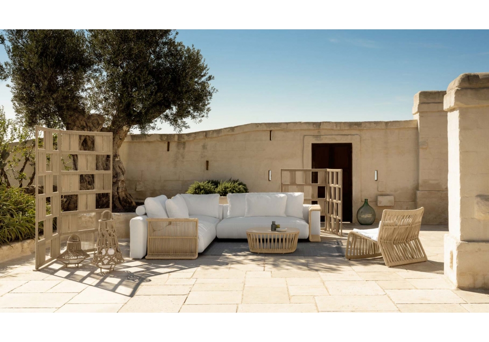 Cliff Dèco diseñado por Ludovica y Roberto Palomba para Talenti es un sofá con respaldo de tela y reposabrazos en aluminio cubierto de cuerda náutica en los acabados de la colección Cliff.