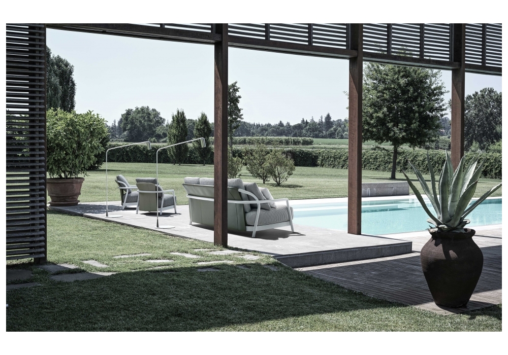 Alison Outdoor diseñada por Carlo Colombo para Flexform es un sofá de la colección Outdoor. Estructura de aluminio con recubrimiento en polvo, respaldo cubierto con espuma de poliuretano. Asiento y respaldo acolchado con espuma de poliuretano y cubierto con tela repelente al agua.