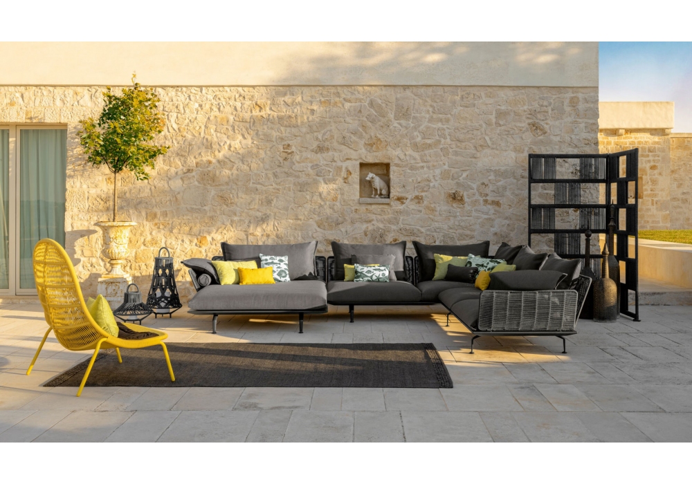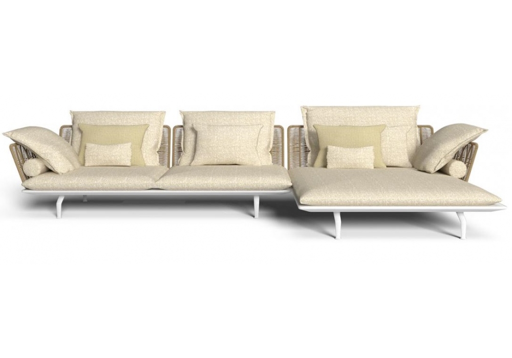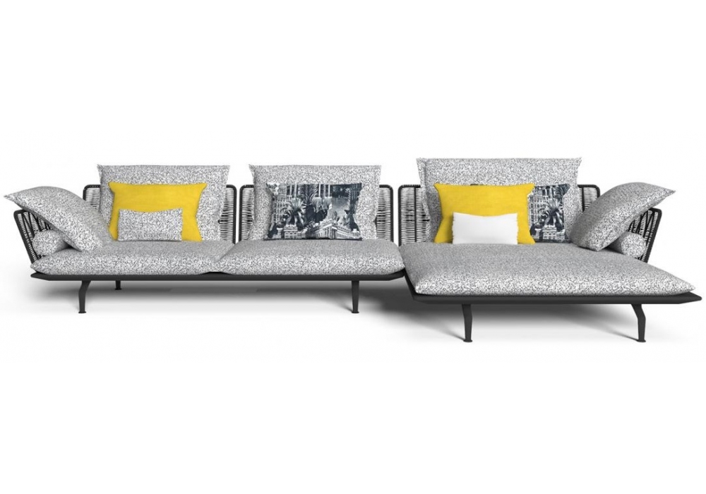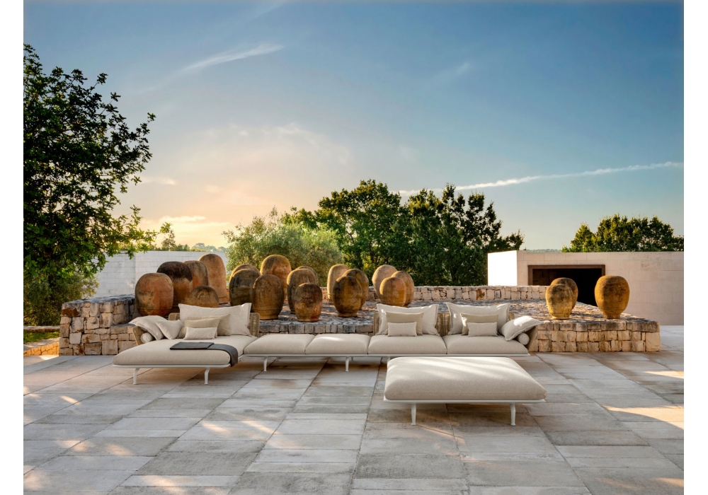 Cruise Alu diseñado por Ludovica y Roberto Palomba para Talenti es un sofá modular. Estructura de aluminio con recubrimiento en polvo disponible en blanco, grafito o gasolina. Cojines extraíbles, acolchado de espuma de secado rápido y cubierto con telas diseñadas para impermeabilizar en exteriores, en varios acabados.