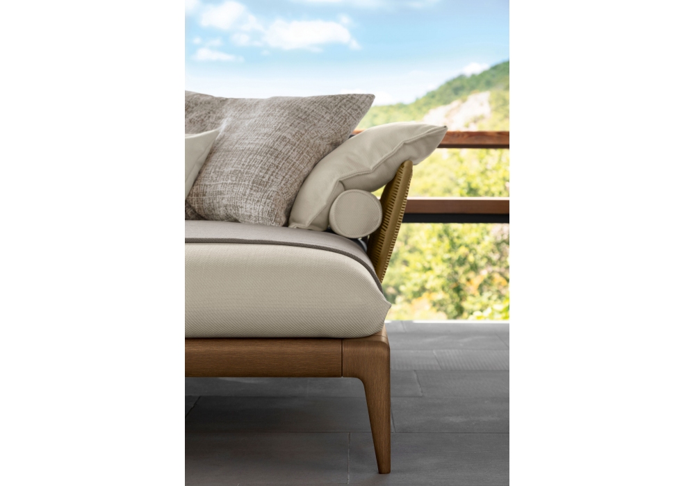 Cruise Teak, diseñado por Ludovica y Roberto Palomba para Talenti, es un sofá de tres plazas. Estructura de madera, respaldo y reposabrazos de cuerda sintética y cojines impermeables.