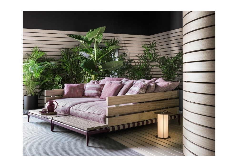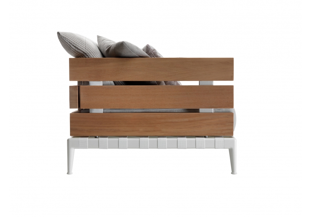 Ansel diseñado por Antonio Citterio para Flexform es un sofá de la colección Outdoor. Base de aluminio, respaldo y apoyabrazos en madera maciza. Cojín de asiento y respaldo de tela repelente al agua. Disponible en dos profundidades.