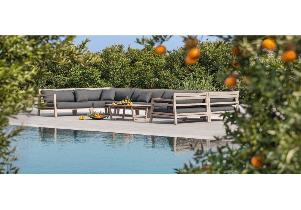 Costes diseñado y producido por Ethimo es un sofá modular con estructura de teca y revestimiento de tejido acrílico, disponible en diferentes acabados.