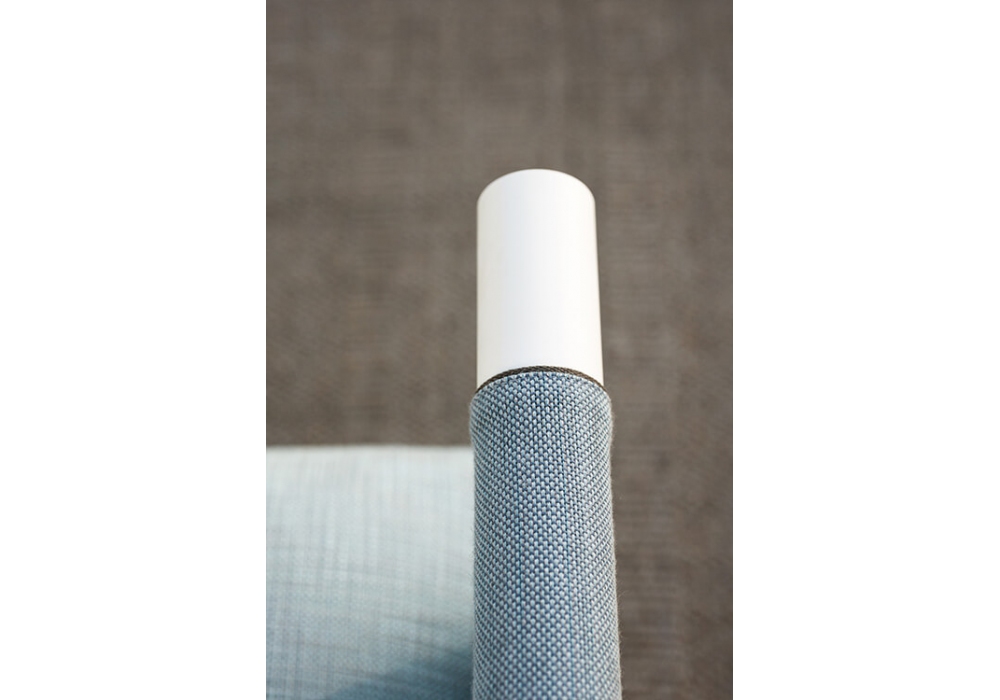 Eden diseñado por Rodolfo Dordoni para Roda es un sofá modular de exterior compuesto por base de teca blanca resistente a la intemperie, acero pintado tapizado en Batyline y cojines tapizados en tela.