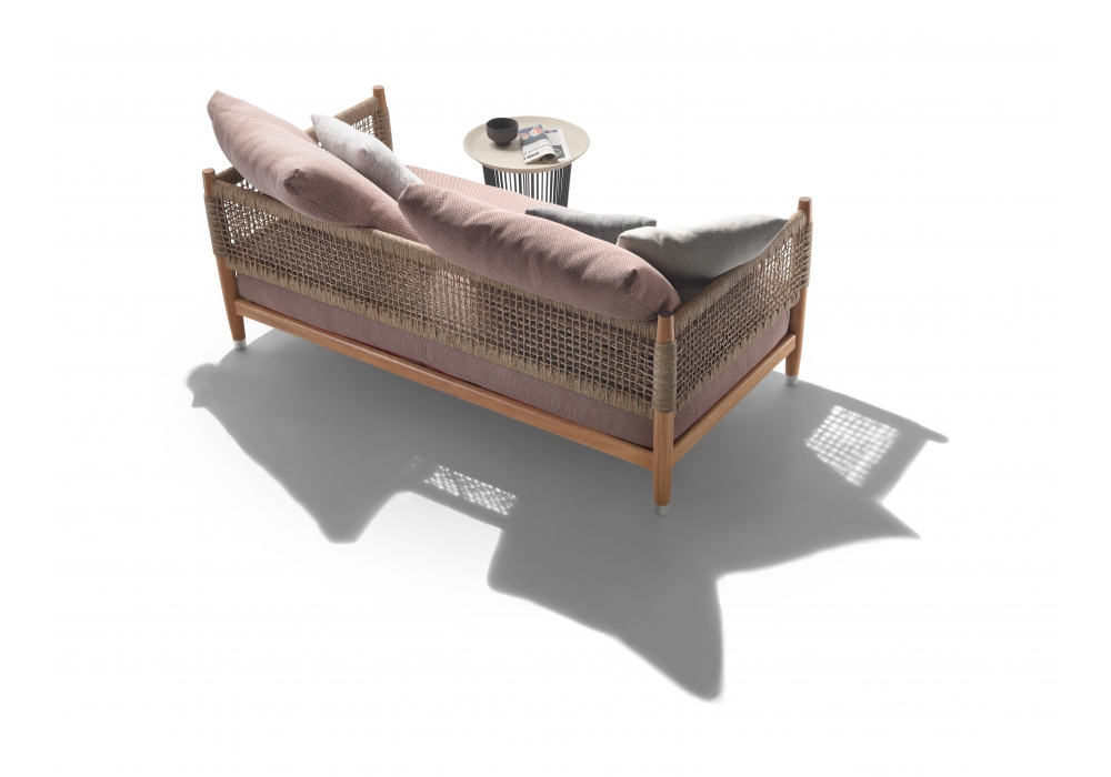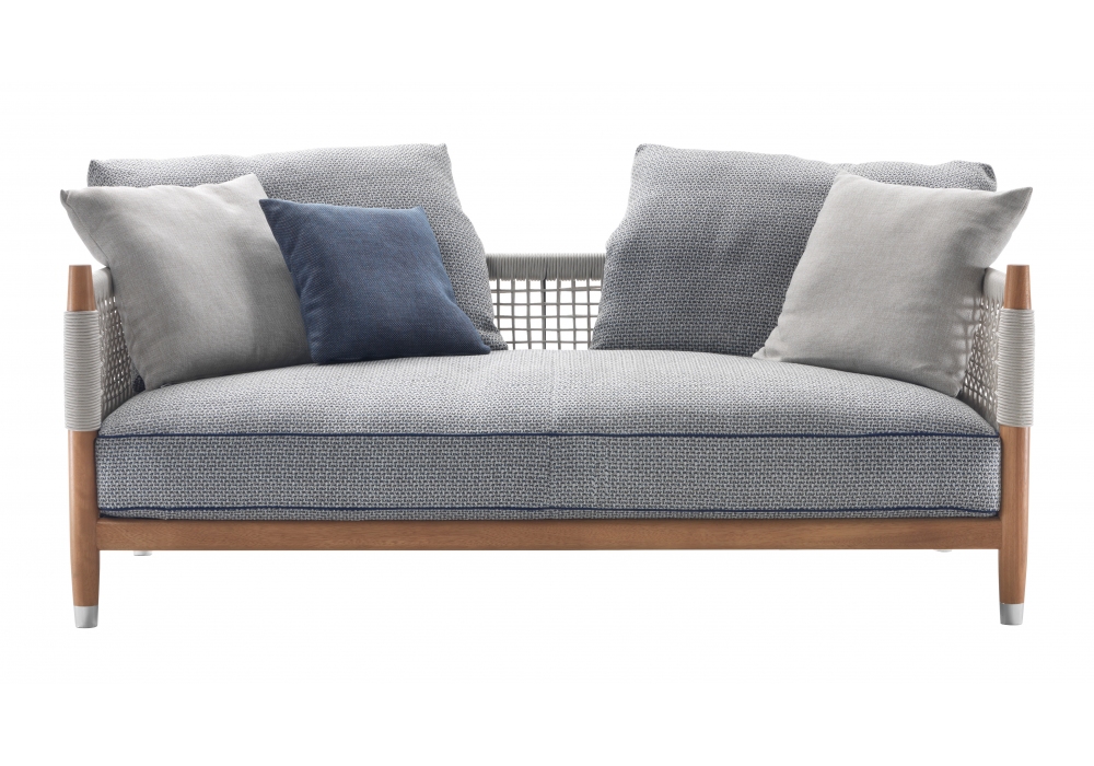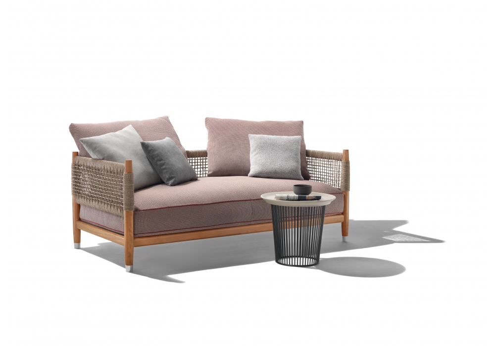 Parker Outdoor diseñado por Antonio Citterio para Flexform es un sofá de exterior con estructura de madera maciza de Iroko, carcasa de cuerda tejida hecha a mano en PVC o polipropileno y cojines tapizados en tela resistente al agua.