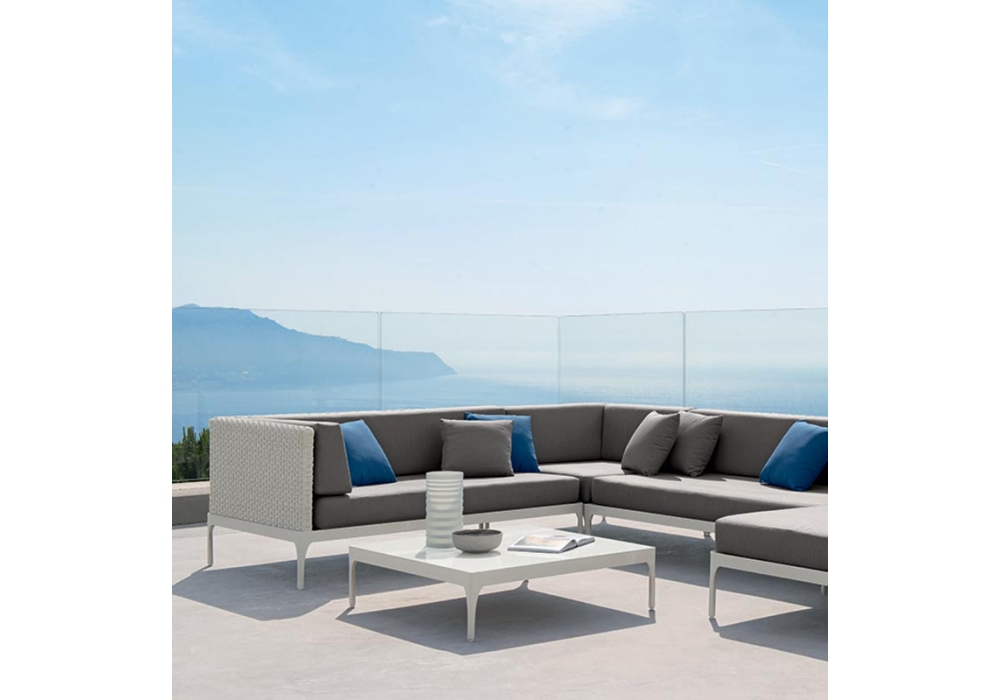 Infinity producido y firmado por Ethimo es un sofá modular con estructura de aluminio pintado cubierta con entrelazado de lightwick. Los cojines son de tejido acrílico hidrófugo. Infinity está disponible en diferentes acabados.