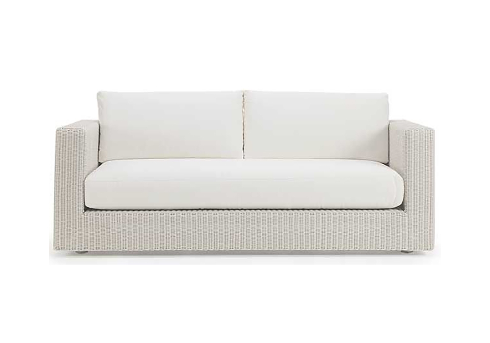 Cube producido y firmado por Ethimo es un sofá de tres plazas en etwick con cojines cubiertos de acrílico marfil y gris tórtola.