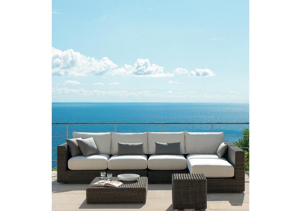 Cube producido y firmado por Ethimo es un sofá modular con estructura etwick y cojines en tejido acrílico, disponible en diferentes acabados.