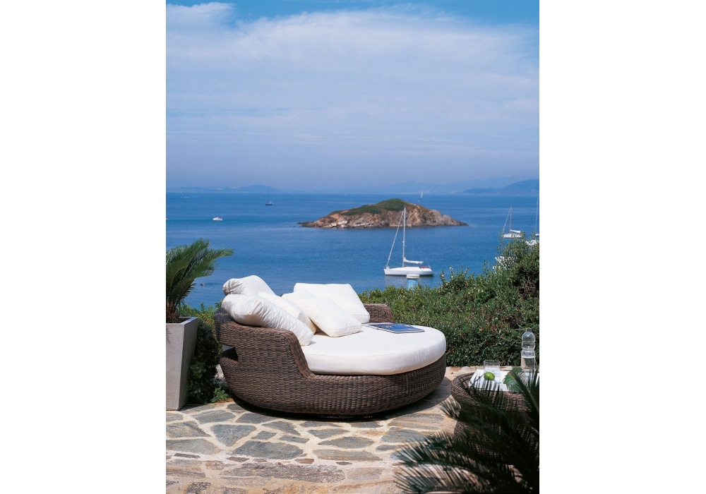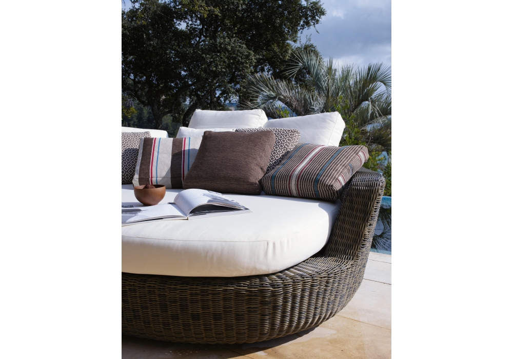 Agorà producido y firmado por Unopiù es un sofá isla con estructura de aluminio y carcasa de fibra sintética waprolace tejida a mano. Los cojines están cubiertos de tela acrílica en diferentes colores. Agorà está disponible en diferentes acabados.
