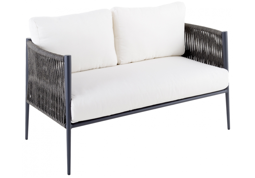 Luce diseñado y producido por Unopiù es un sofá con estructura de aluminio color grafito revestido a mano con cuerda de poliolefina. Los cojines de asiento y respaldo están confeccionados en tejido acrílico en diferentes acabados.