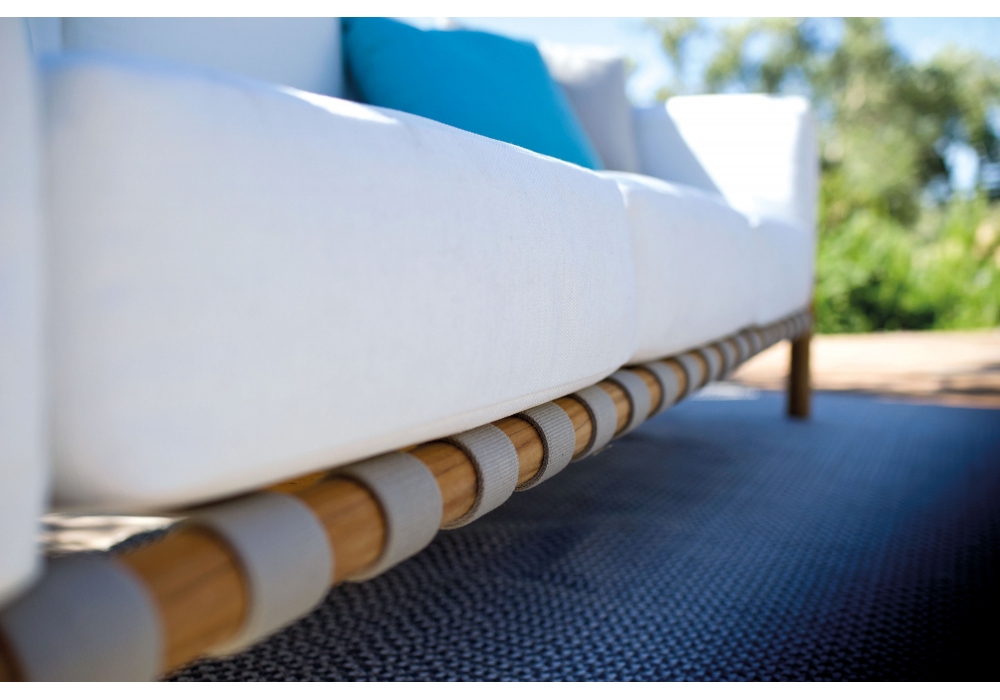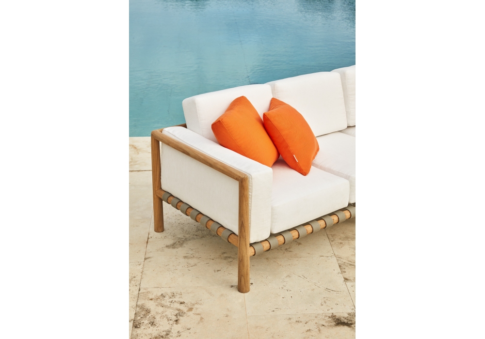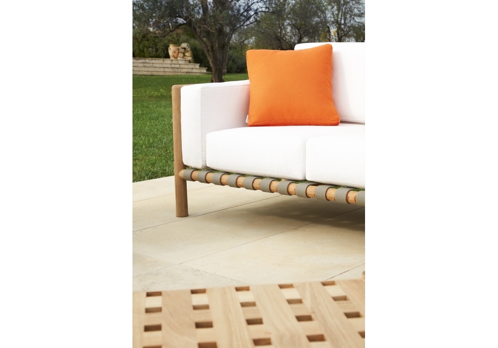 Pevero diseñado y producido por Unopiù es un sofá con estructura de madera de teca. Los cojines del asiento y del respaldo están confeccionados en tejido acrílico en diferentes acabados. Pevero está disponible en diferentes tamaños.
