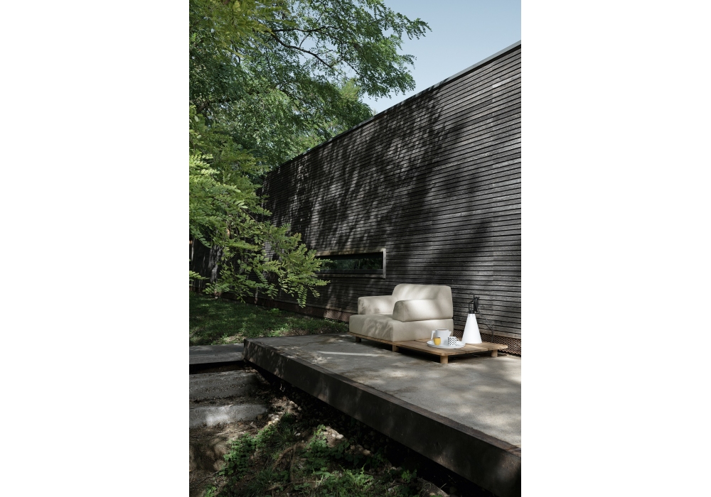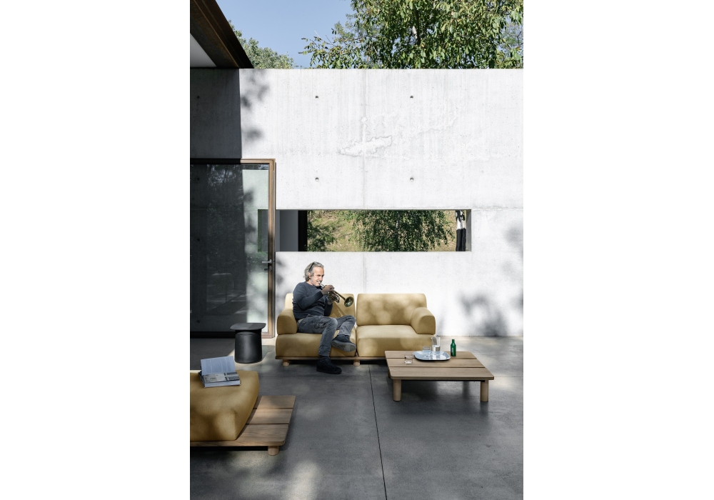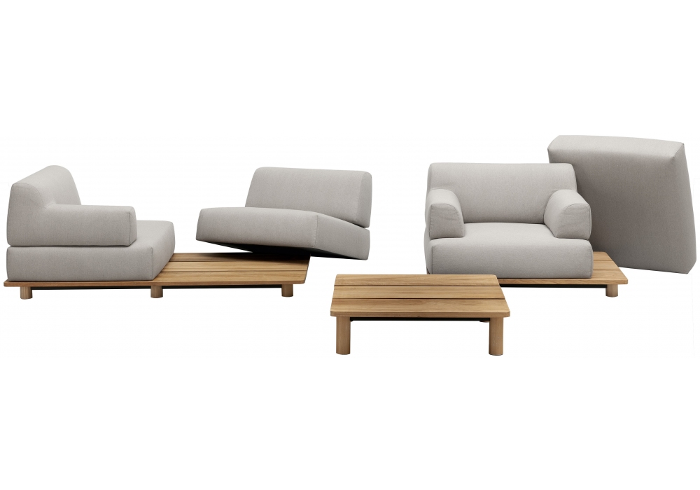 Palco diseñado por Sam Hecht & Kim Colin para Kristalia es un sistema de asientos para exteriores compuesto por una plataforma de listones de teca con base de metal y uno o más elementos acolchados, que se pueden usar solos o combinados para crear diferentes configuraciones. Tapicería propuesta en tela en una amplia gama de colores.