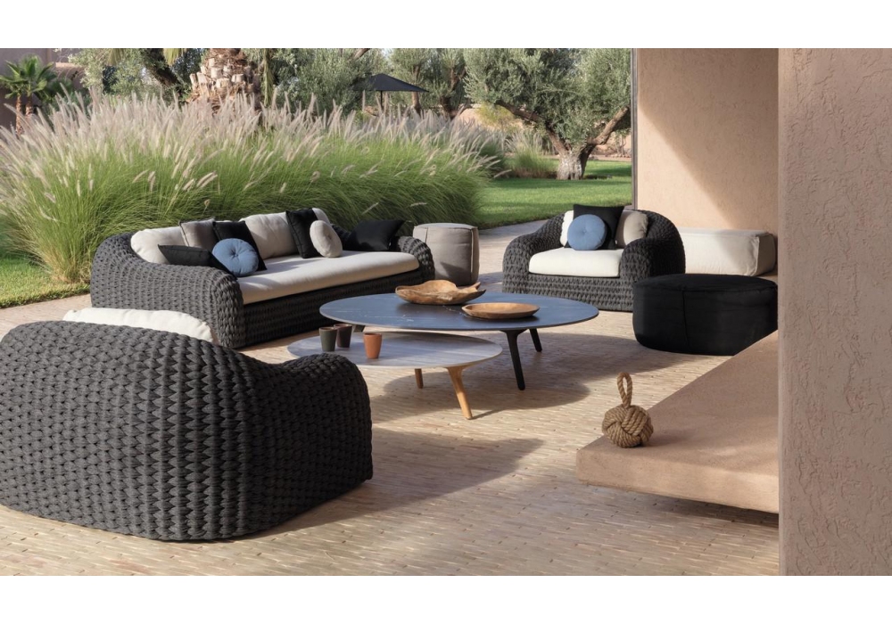 Kobo diseñado por Stephane De Winter para Manutti es un sofá de exterior de 3 plazas con estructura de cuerda tejida a mano alrededor de un marco de aluminio soldado. Disponible en diferentes acabados.