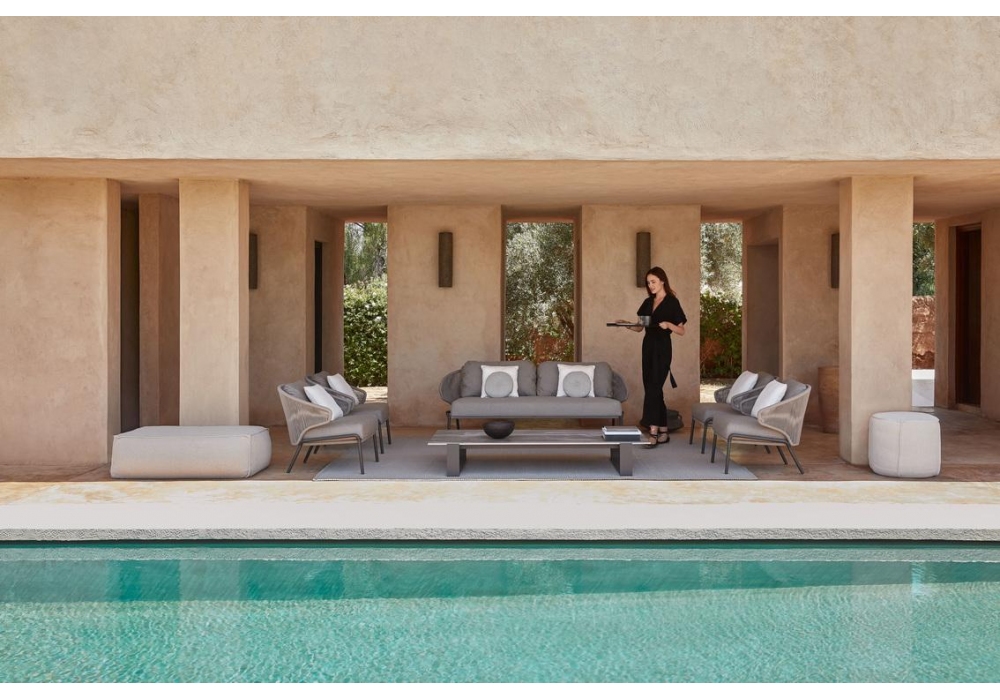 Radius diseñado por Stephane De Winter para Manutti es un sofá de exterior realizado con una estructura de acero inoxidable y cuerda tejida. Tapizado de los cojines en tela. Disponible en diferentes acabados y medidas.