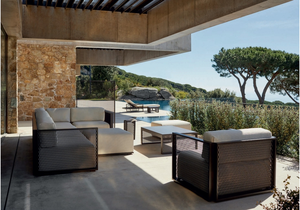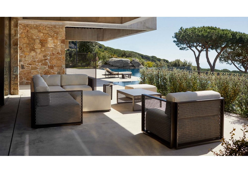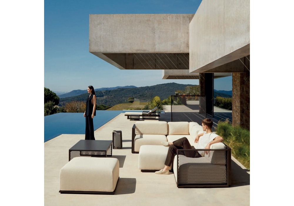 The Factory diseñado por Ramón Esteve para Vondom es un sofá modular realizado con estructura de aluminio y cojines acolchados con tapizado en tela. Esta colección es adecuada para uso en interiores y exteriores.