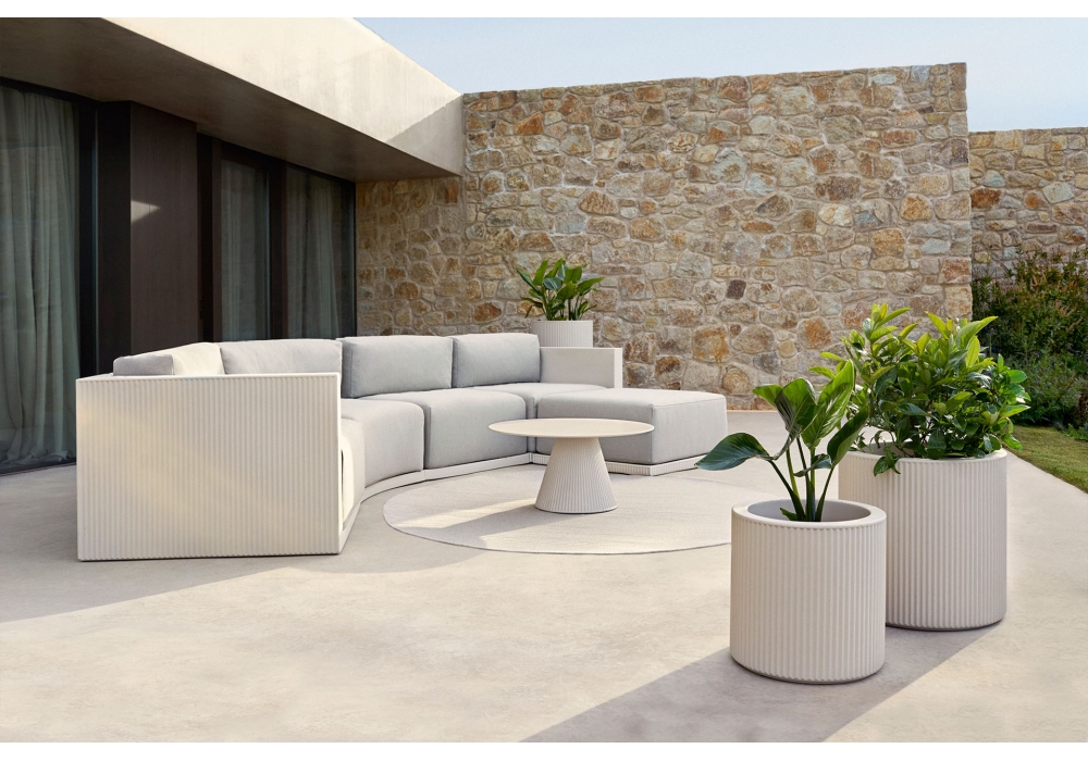 Gatsby diseñado por Ramón Esteve para Vondom es un sofá modular realizado en resina de polietileno por rotomoldeo y cojines acolchados con revestimiento de tela. 100% reciclable. Artículo adecuado para uso en interiores y exteriores. Disponible en diferentes acabados.