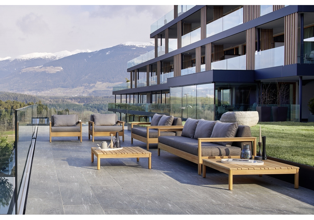 Bali diseñado por Alessandro Dubini para Varaschin es un sofá con estructura de soporte visible en madera maciza de teca de plantación certificada. Asientos y respaldos acolchados con goma Dryfeel para uso en exteriores. Disponible en dos tamaños y con tapizado en diferentes acabados.