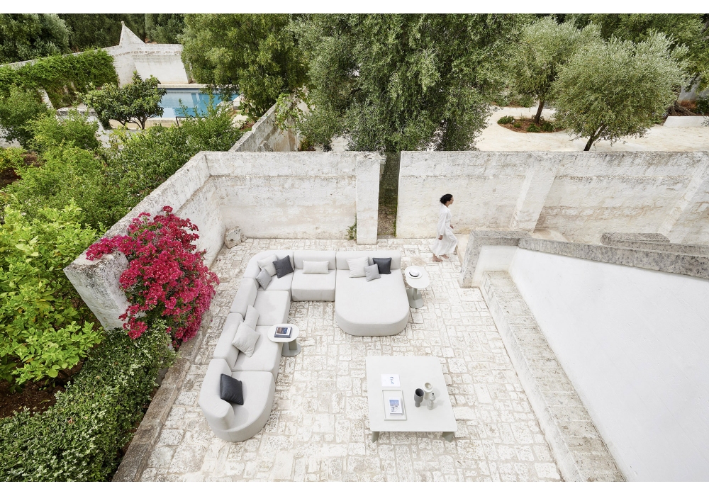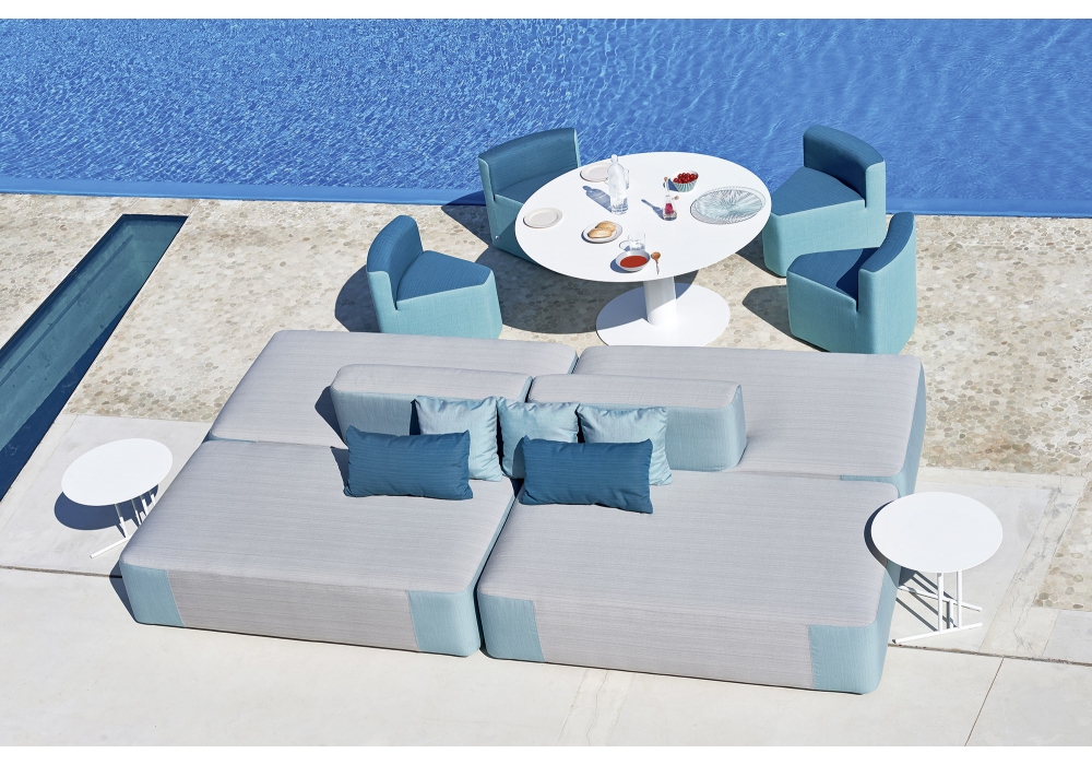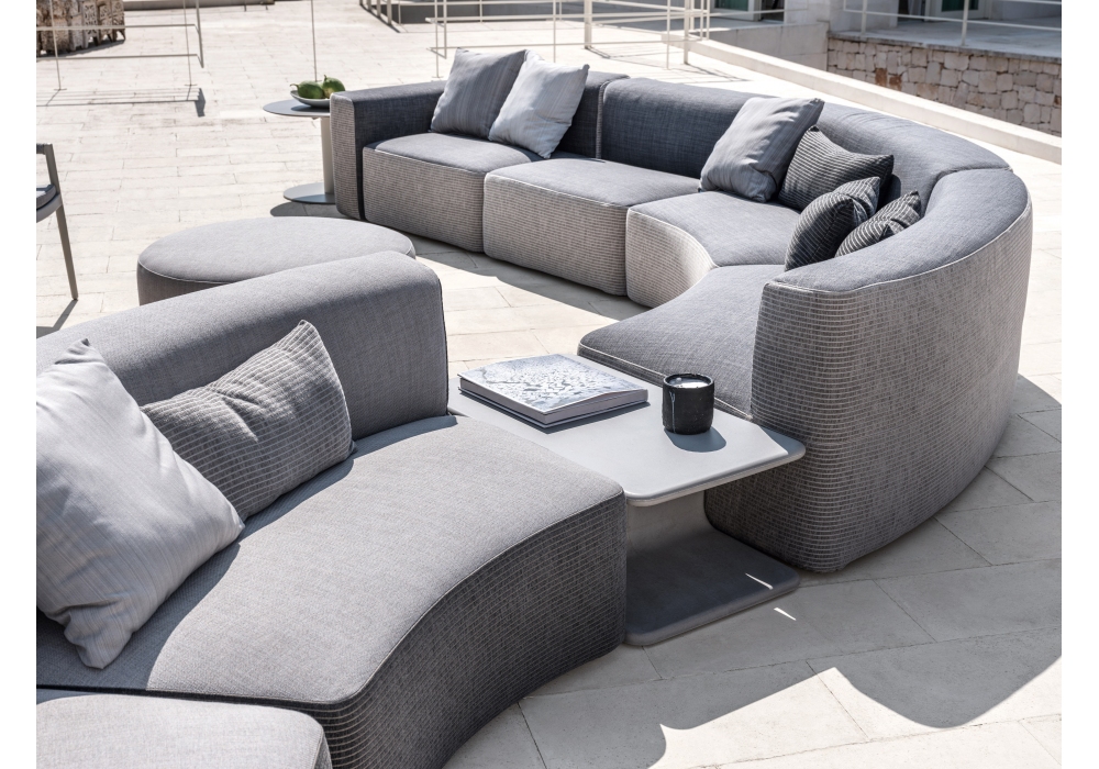 Belt diseñado por Daniele Lo Scalzo Moscheri para Varaschin es un sofá modular con estructura portante en madera maciza de okumè y acolchado con goma Dryfeel para uso exterior. Disponible en diferentes composiciones y en versión monotejido o bitejido con diferentes colores.