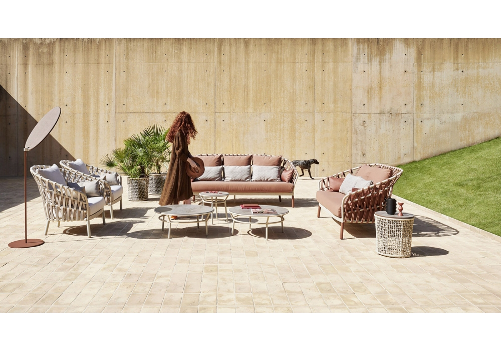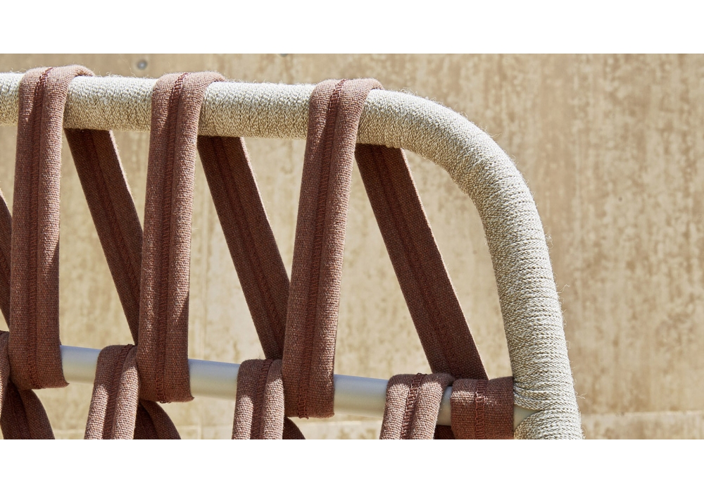 Emma Cross diseñado por Monica Armani para Varaschin es un sofá con base de aluminio pintado en polvo. Estructura en aluminio pintado en polvo tejido con banda en tejido acrílico. Tapizado de asiento en tejido y acolchado con goma Dryfeel para uso exterior. Disponible en diferentes acabados.