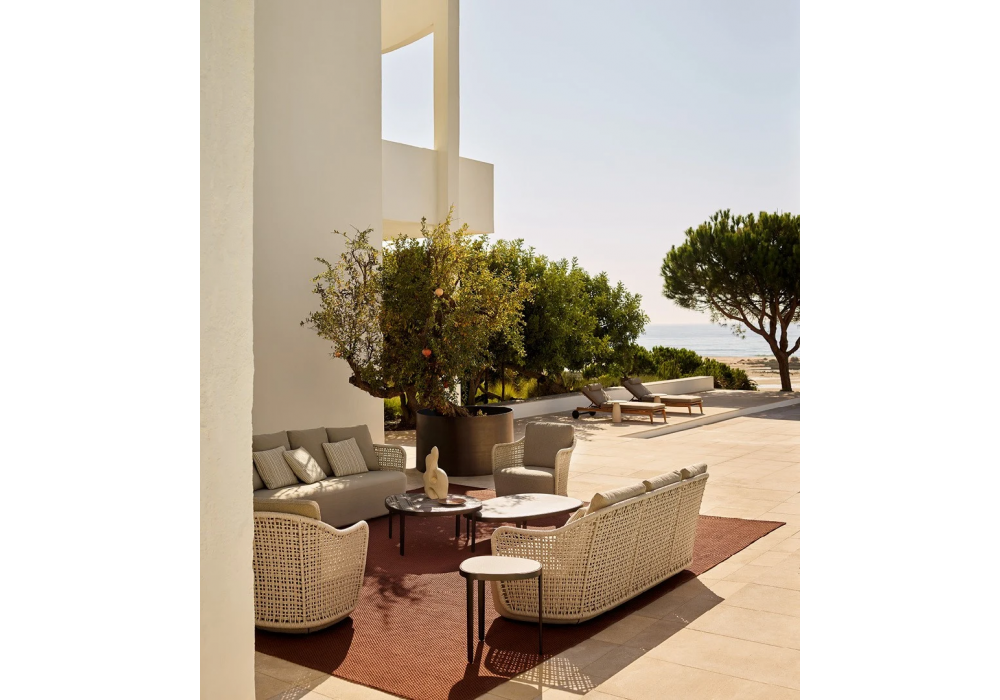 Mad Out diseñado por Marcel Wanders para Poliform es un sofá con estructura de respaldo en tubular de acero inoxidable revestido en cuerda tubular de polipropileno y respaldo en cuerda tejida. Pies en material termoplástico. Cojín de asiento en poliuretano flexible moldeado y cojines de respaldo en poliéster PET reciclado. Prerevestimiento en fibra de poliéster con costuras termoselladas. Funda desenfundable en tejido.