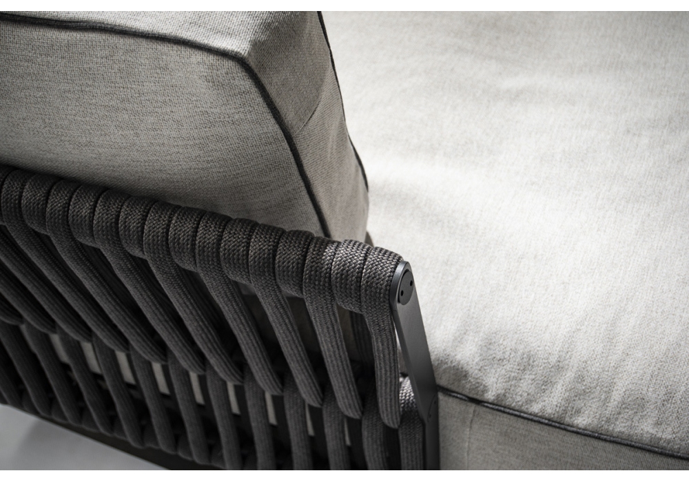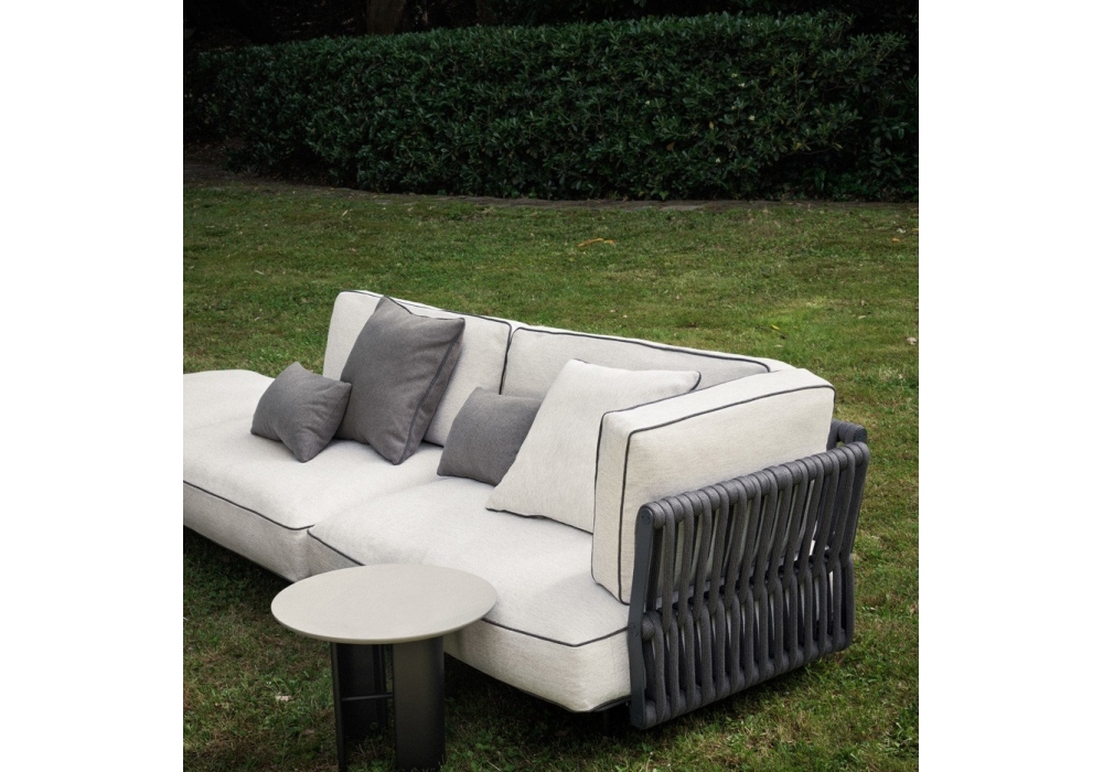 Soul diseñado por Gabriele y Oscar Buratti para Potocco es un sofá de exterior modular con patas de acero inoxidable y estructura con tejido capitoné antracita. Los cojines del respaldo y del asiento son desenfundables y desmontables de la estructura y están tapizados en diferentes tejidos. Borde de contraste bajo pedido.