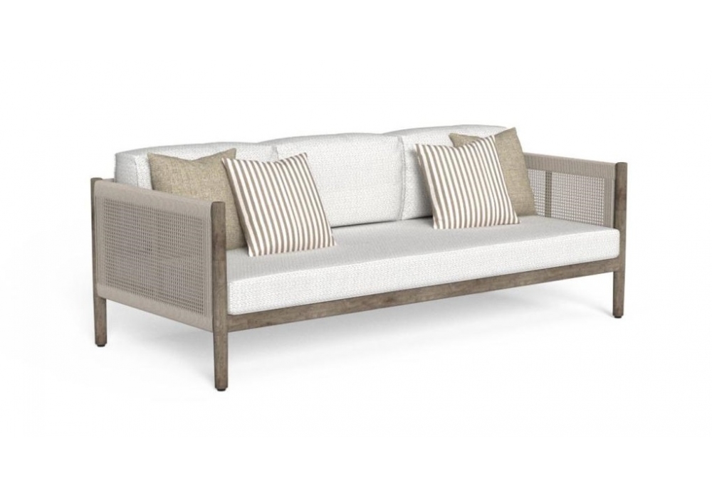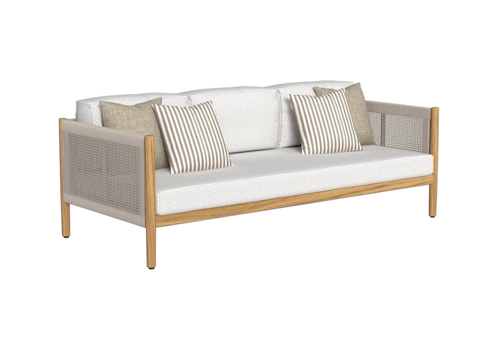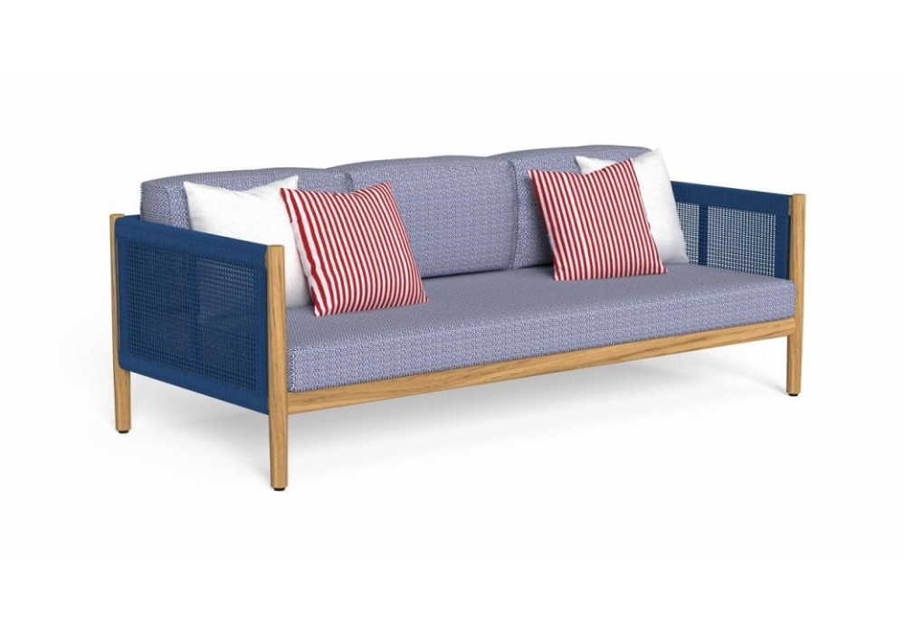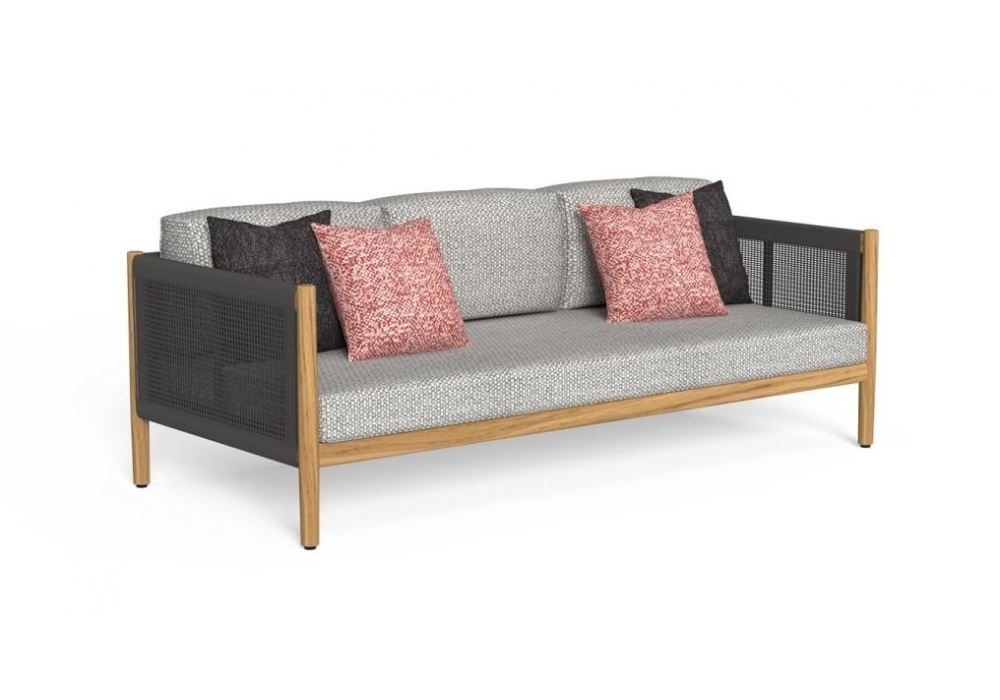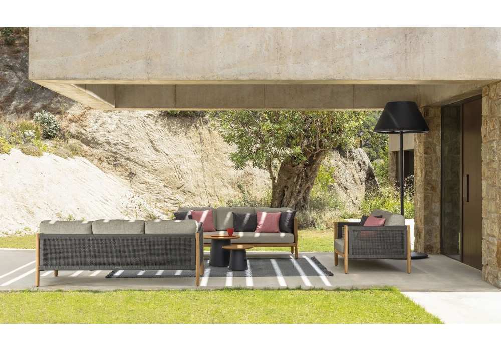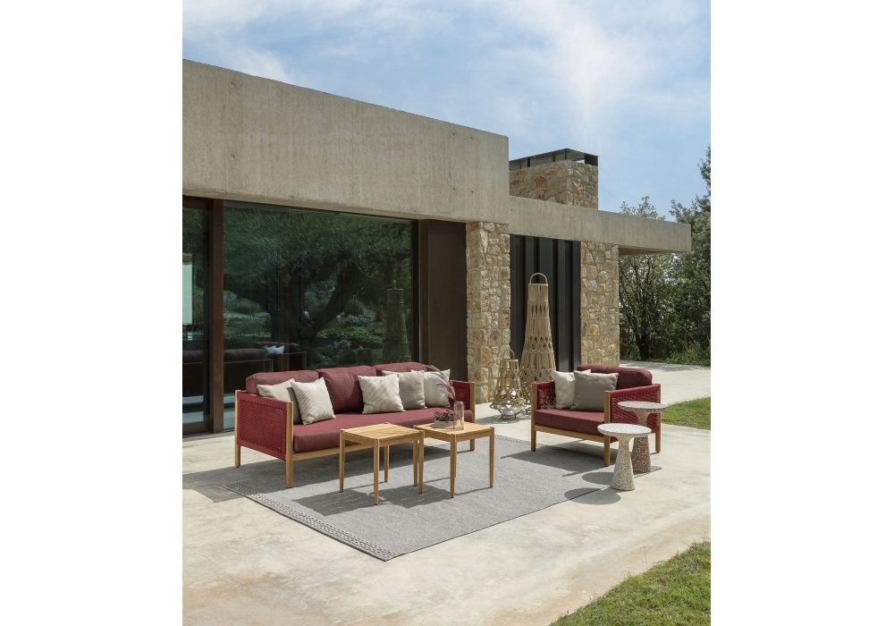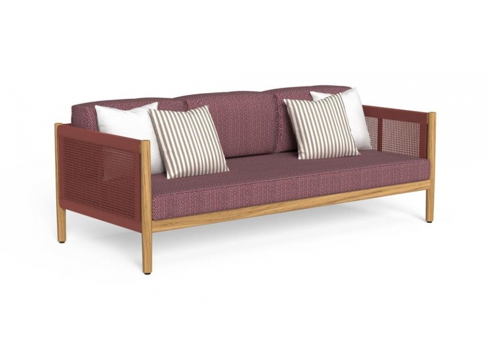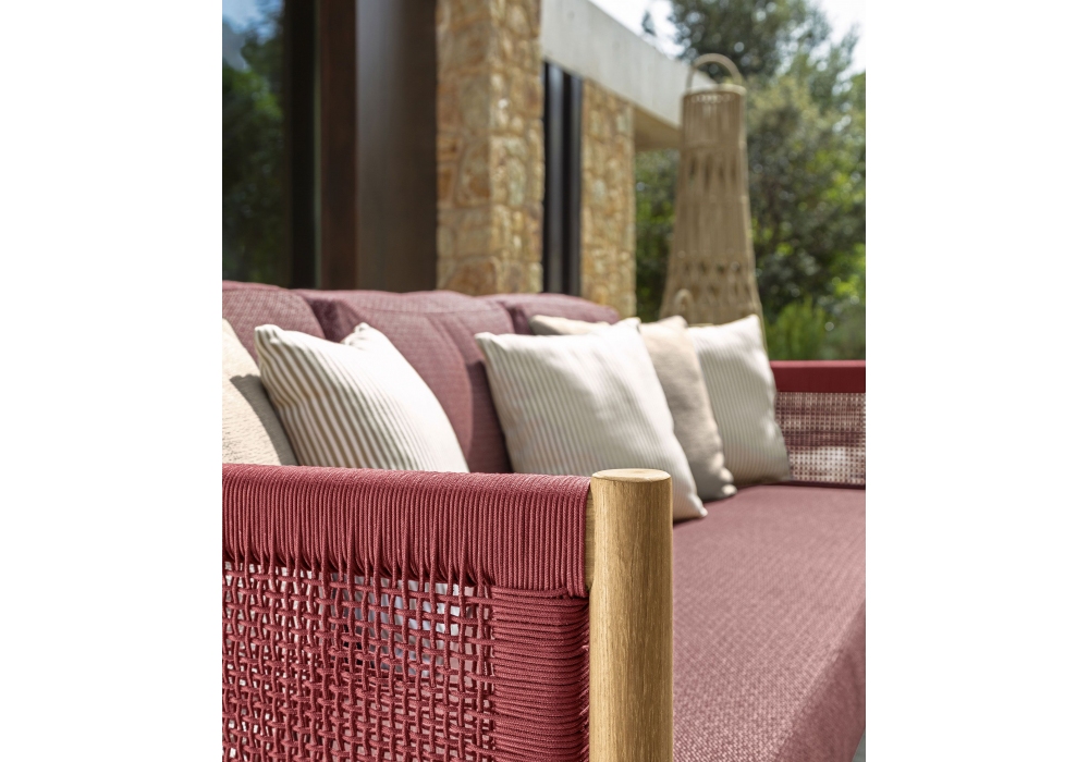 Dolcevita diseñado por Talenti es un sofá con estructura de madera, costado y respaldo en cuerda sintética acolchada, cojines de asiento y respaldo acolchados con revestimiento de tela. Disponible en diferentes acabados.