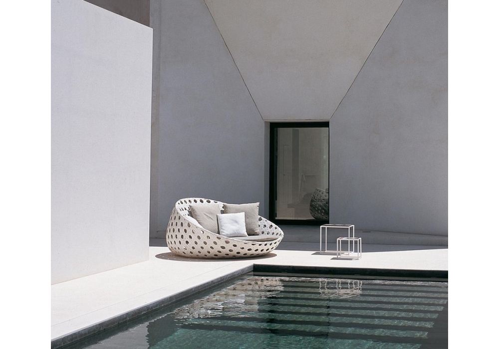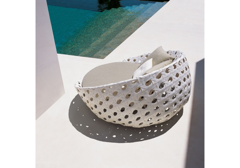 Canasta diseñado por Patricia Urquiola para B&B Italia Outdoor es un sofá con estructura en aluminio pintado en polvo poliéster blanco y entrelazado en polietileno blanco. Cojín de asiento de poliuretano perfilado y cojín de respaldo de fibra de poliéster, funda de fibra de poliéster hidrófuga. Revestimiento de tela. Disponible con capota en fibra de vidrio pintada y revestimiento en tejido Batik bianco.