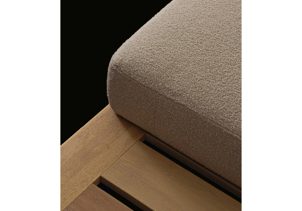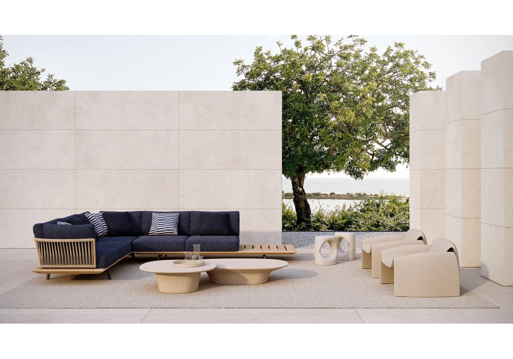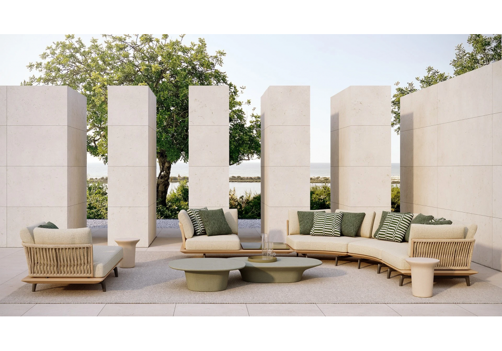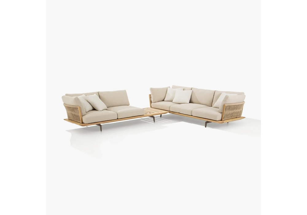 Lagoon diseñado por Emmanuel Gallina para Poliform es un sofá con base de teca maciza y patas de aluminio repujado pintado en color óxido. Respaldo de tubo de acero inoxidable revestido de cuerda en tonos ladrillo y marrón oscuro o de cuerda trenzada natural. Cojines de poliéster reciclado PET con insertos de poliuretano de densidad diferenciada. Tapizado de tela desenfundable.
