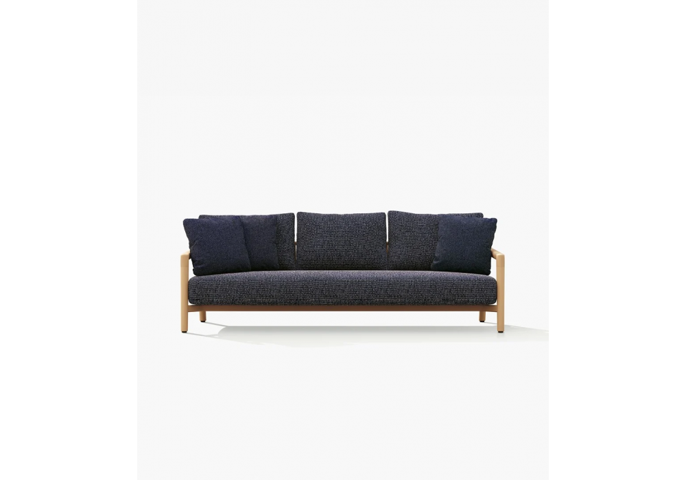 Ponte diseñado por Emmanuel Gallina para Poliform es un sofá con estructura de teca maciza y respaldo de tubo de acero inoxidable pintado, tejido con cuerda en tonos ladrillo, marrón oscuro o natural. Cojines de asiento y respaldo de poliéster PET reciclado con inserto de poliuretano, tapizados en tela desenfundable. Cojín opcional disponible.
