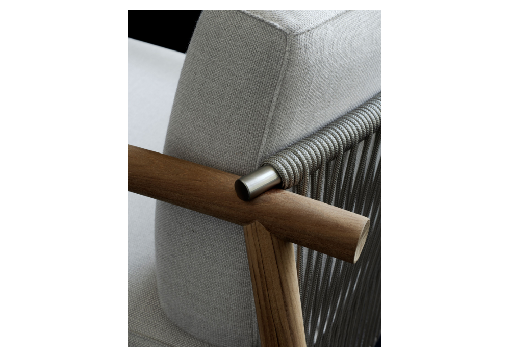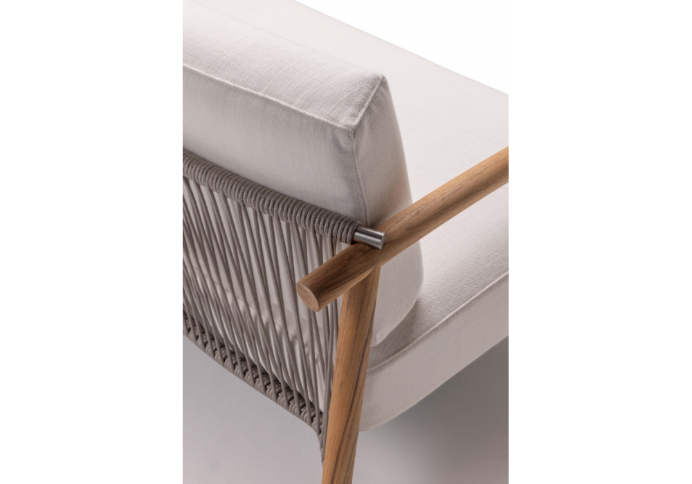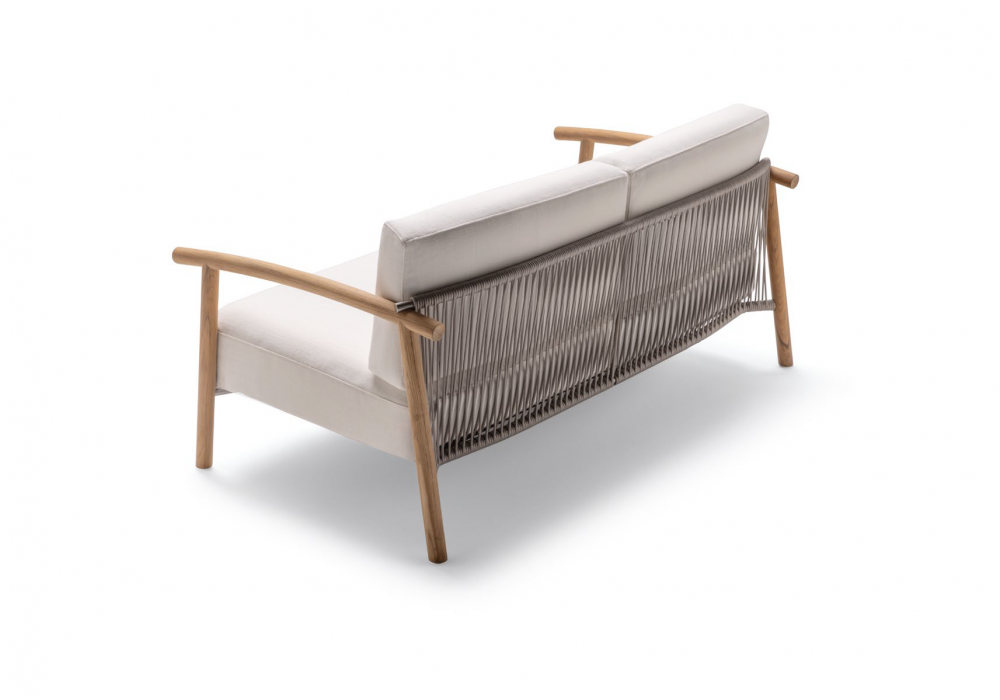 Kasumi diseñado por Mist-o para Living Divani es un sofá con estructura de acero inoxidable satinado mate, laterales de teca maciza y respaldo con cuerda sintética en diferentes acabados. El tapizado de los cojines está realizado en diferentes telas.
