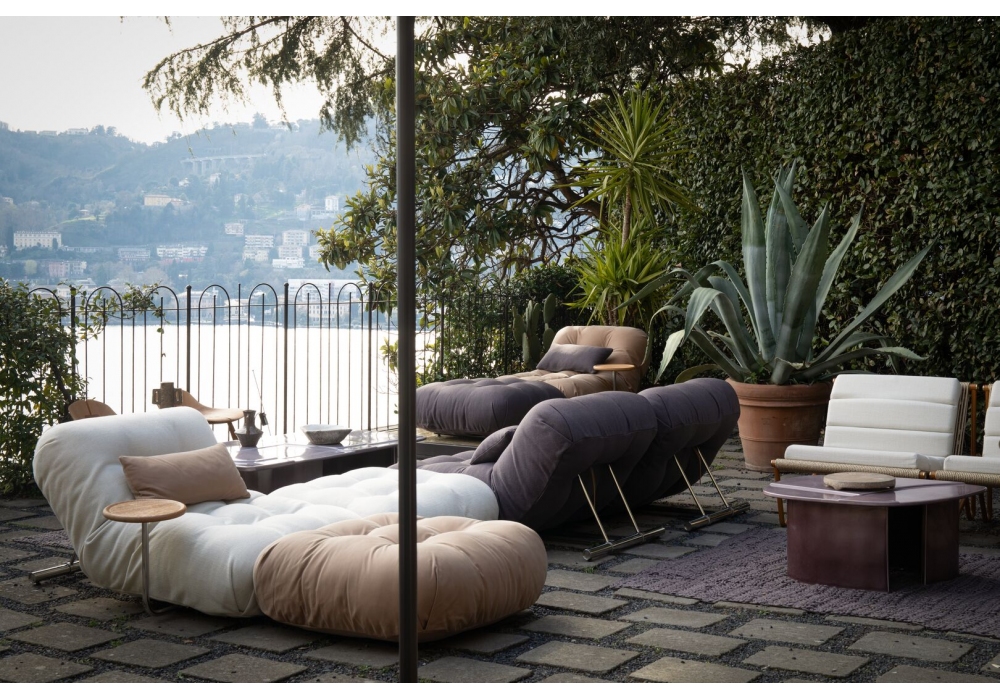 Eileen Outdoor diseñado por Baxter P. es un sofá modular con estructura de acero inoxidable 316 pulido o latón satinado y acolchado de espuma de poliuretano de densidad diferenciada. Mesa auxiliar de iroko macizo arenado con acabado al aceite, con opción de acabado. Revestimiento desenfundable.