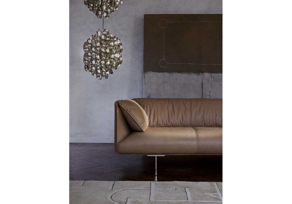 John-John, diseñado por Jean-Marie Massaud para Poltrona Frau, es un sofá disponible en tres dimensiones. Pies de aluminio acabado rutenio con tapones de plástico transparente. Tapizado en piel Frau®, no desenfundable. Los cojines del respaldo y los reposabrazos están unidos a la estructura gracias a la tapicería de piel Pelle Frau®, que presenta una superficie microperforada en la parte inferior.