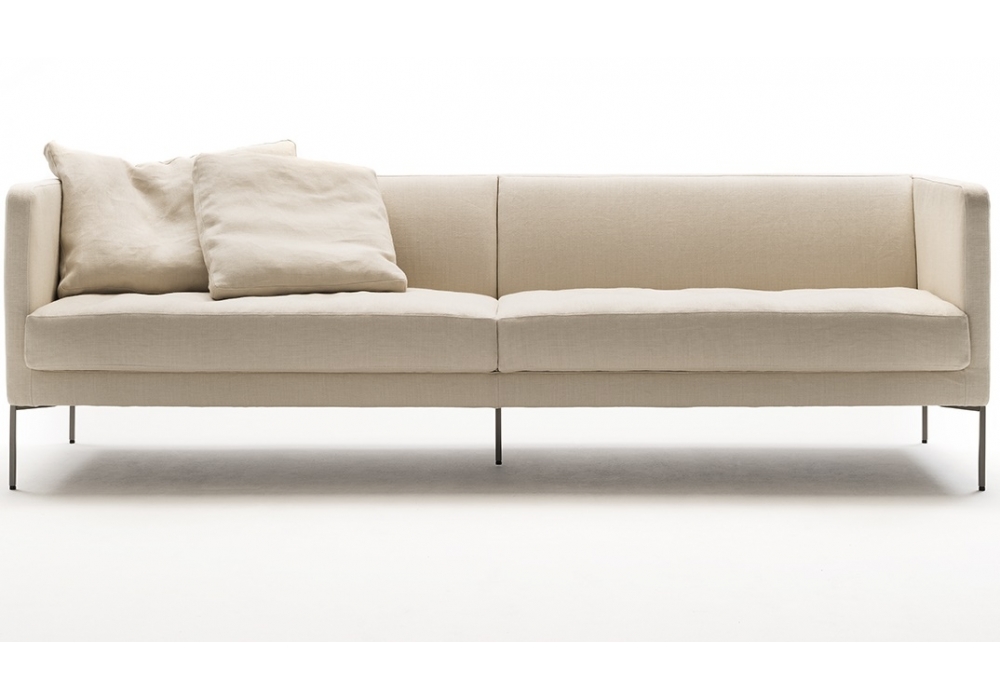 The Easy Lipp sofa designed by Piero Lissoni for Living Divani moulds environments with character and lightness, hosting daily moments of relax. Fix and modular sofa with backrest and armrest frame in doublepaneled pinewood and padding in polyurethane foam and acrylic fibre layers; seat chassis in 40x30mm tubular steel with black epoxy powder coating, sprung with elastic straps inset in the base structure in multilayer poplar wood padded in polyurethane foam covered in 100% polyether thermally bonded onto a polyamide velveteen backing. Backrest cushions, fixed to the structure through the coverings, in polyurethane foam and acrylic fibre layers. Quilted seat cushions, in prewashed and sterilized goose down, stitched into separate compartments, with differentiated density polyurethane foam insert. Additional loose cushions, available in two sizes (50 x 50 cm o 70 x 50 cm); fabric or leather upholstery, both fully removable by zippers. Grosgrain piping when in fabric and piping in the same finish as the seat when in leather. Tubular steel feet, joined by a bracket in square section 15 x 15 mm, with bronzed epoxy powder coating with adjustable black PVC tips. Fabric or leather upholstery, with sewn stitching at sight on seat cushion only, both fully removable by zippers and Velcro fastenings.