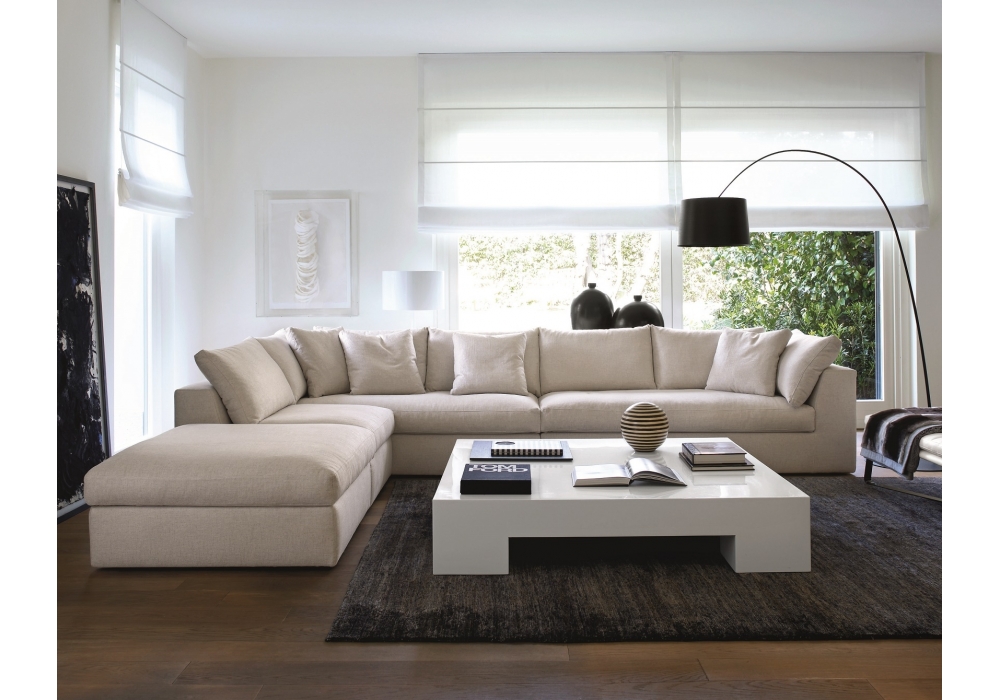 Louis Small designed by Andrea Parisio for Meridiani is a sofa with wooden frame and non-deformable polyurethane padding. Black ABS feet. Upholstery available in fabric or leather. Made of different sizes with possibility of different modular configurations.