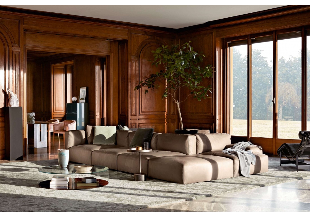 271 Mex Cube diseñado por Piero Lissoni para Cassina es un sofá realizado con una estructura básica en tubo de acero de sección cuadrada pintado de color negro. Los cojines están acolchados con guata de fibra de poliéster o pluma de ganso y tapizados en tela o piel.