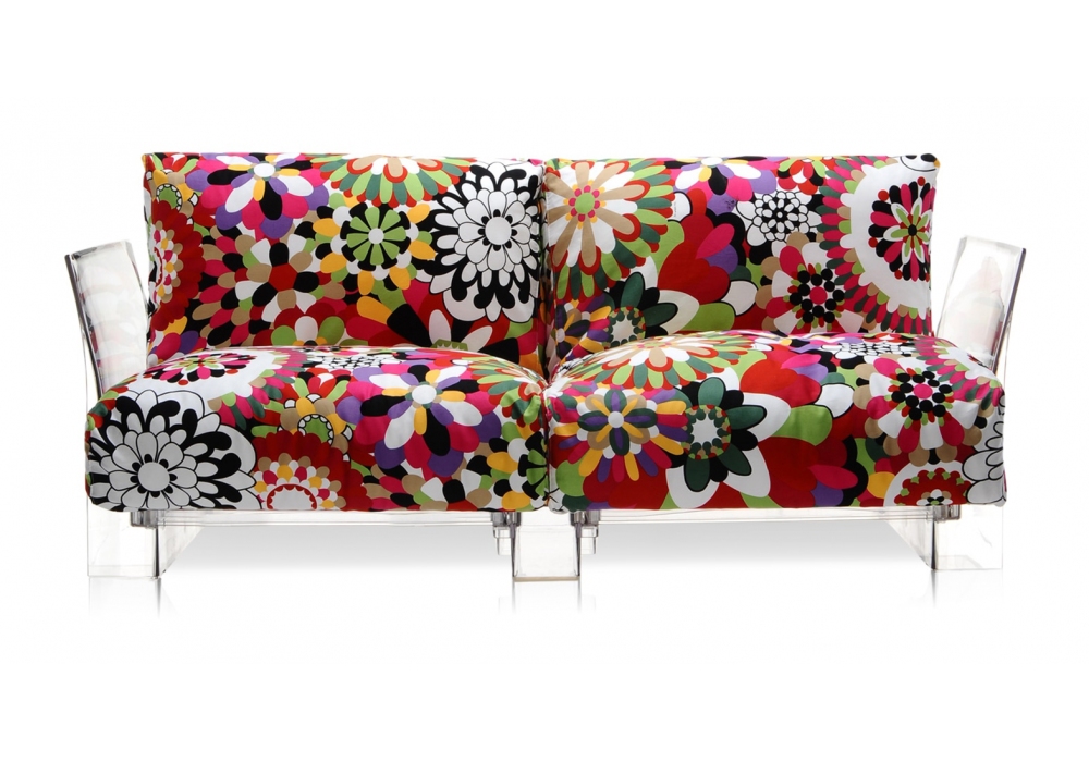 Pop Missoni diseñado por Piero Lissoni & Carlo Tamborini para Kartell es un sofá realizado con estructura en policarbonato transparente y cojines de asiento y respaldo en pluma de ganso y lazo. Tapicería desenfundable en tejido Missoni.