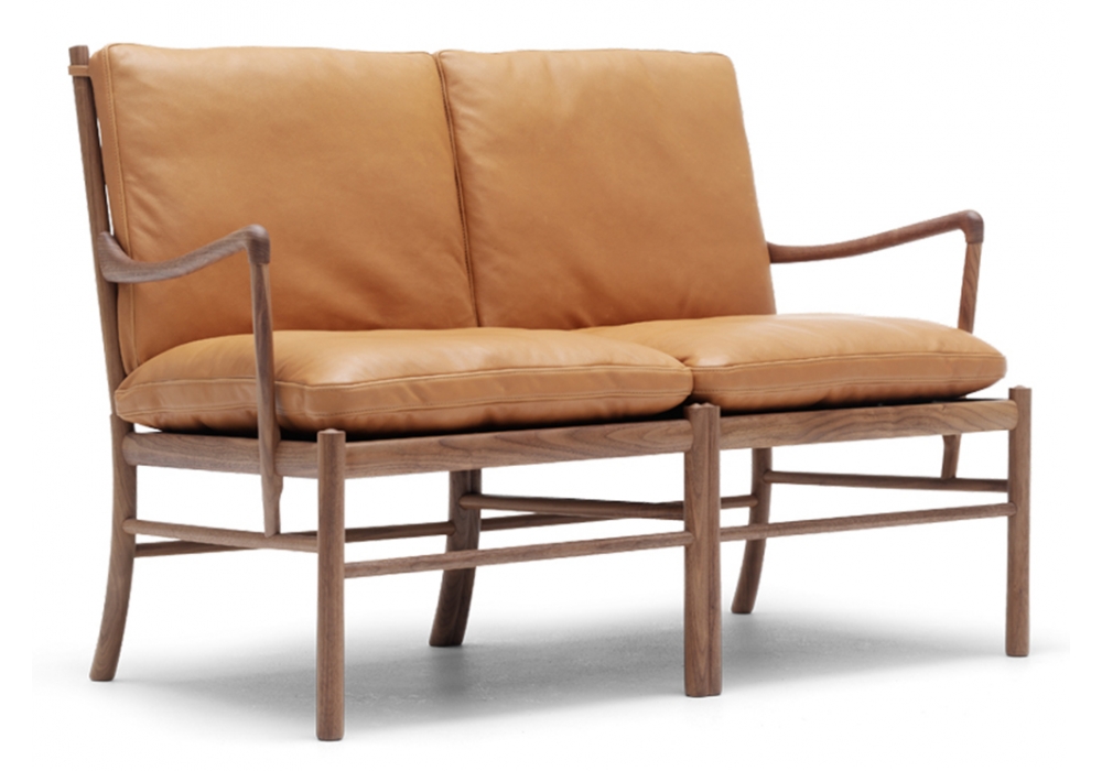OW149-2 Colonial Sofa diseñado por Ole Wanscher para Carl Hansen & Søn es un sofá con estructura en madera de nogal o roble en diferentes acabados, asiento y respaldo tapizados con revestimiento disponible en diferentes telas o pieles. Viene con cojines sueltos y el asiento se mueve libremente en la estructura.