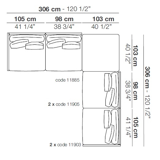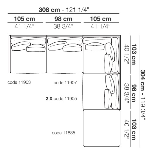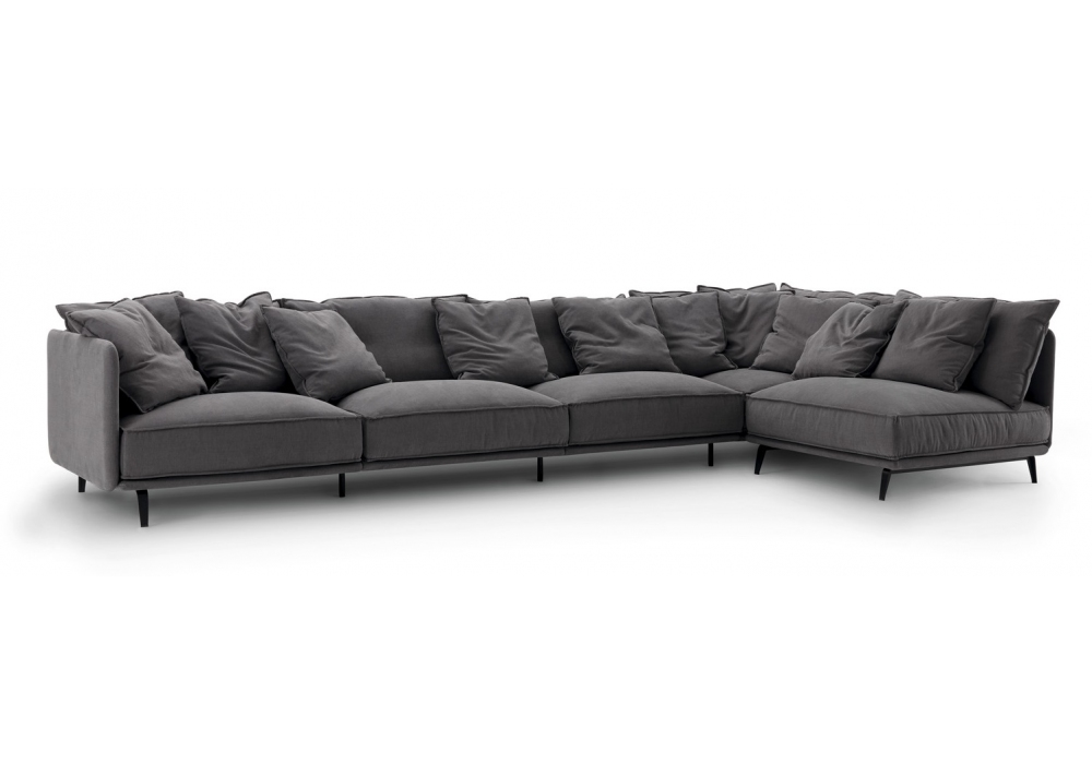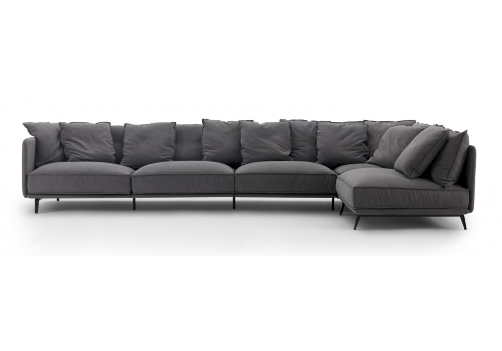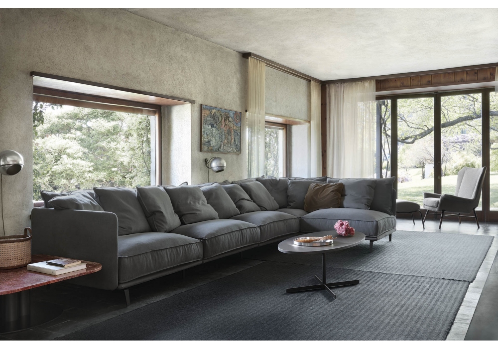 K2 diseñado por Carlo Colombo para Arflex es un sofá disponible en configuración fija o modular. Patas de metal lacado negro o bruñido. Cojín de asiento en poliuretano conformado de densidad diferenciada y revestimiento antiplumas de oca. Cojines de respaldo en revestimiento antiplumas de oca. Revestimiento en tejido o piel.