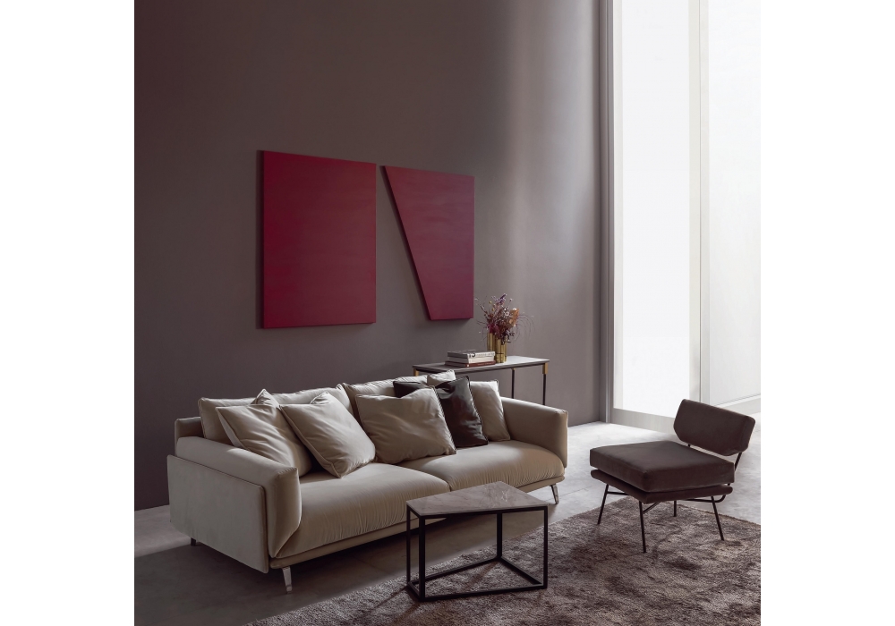Faubourg diseñado por Carlo Colombo para Arflex es un sofá fijo con tapizado disponible en tejido o piel. Patas en laca negra o bruñida. Cojín de asiento en poliuretano conformado de densidad diferenciada / fibra de poliéster. Cojín de respaldo en plumón de oca / forro antiplumas.