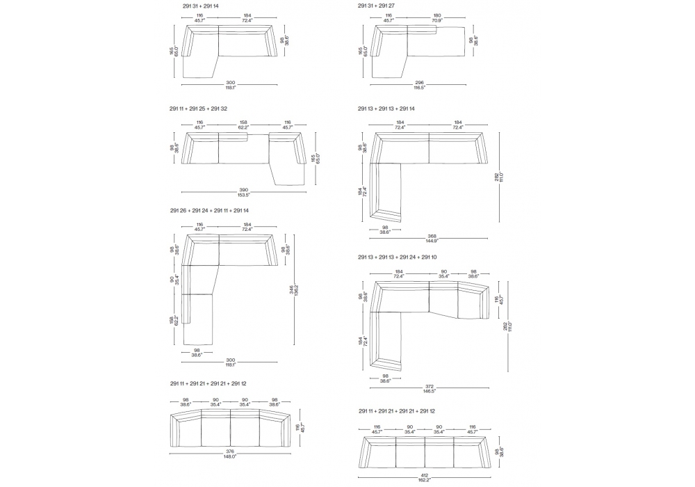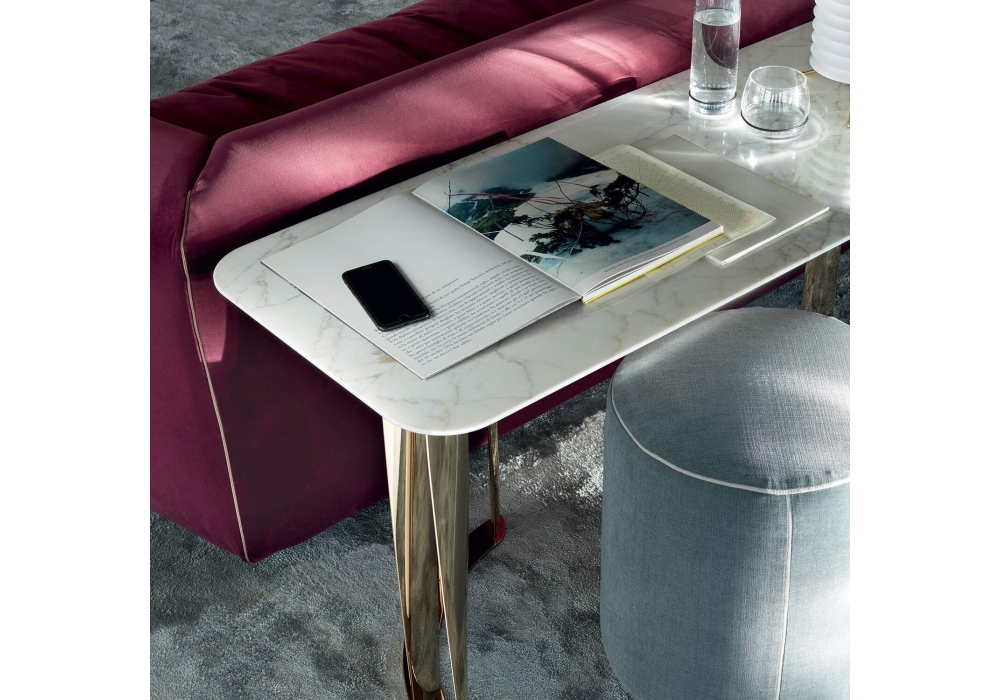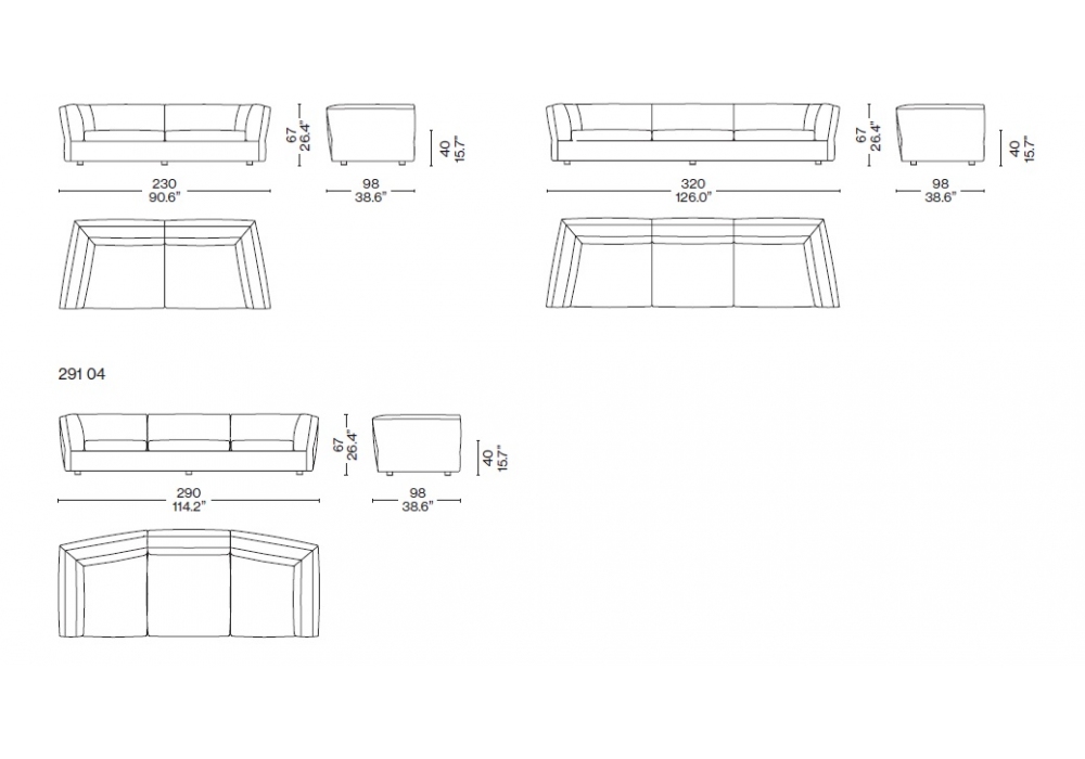 291 Dress-Up! diseñado por Rodolfo Dordoni para Cassina es un sofá con estructura de contrachapado de abeto, correas elásticas, relleno de espuma de poliuretano de densidad variable y tapizado de tela o piel. Ribete de grogrén.