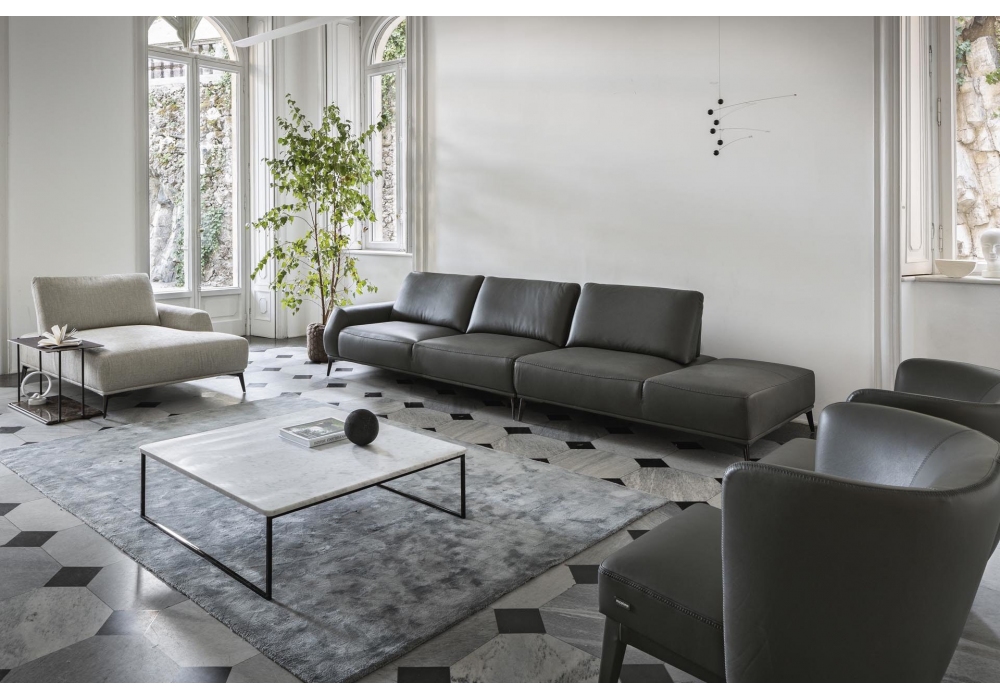 Monforte diseñado por Nicoline es un sofá con estructura de madera y madera contrachapada. Funda en tejido o piel, no extraíble. Pies en metal pulido, satinado, bronce y pintado.