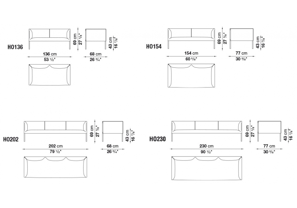 | Dimensiones | L 136 x W 68 x H 69 cm; L 154 x W 77 x H 69 cm; L 202 x W 68 x H 69 cm; L 230 x W 77 x H 69 cm. |