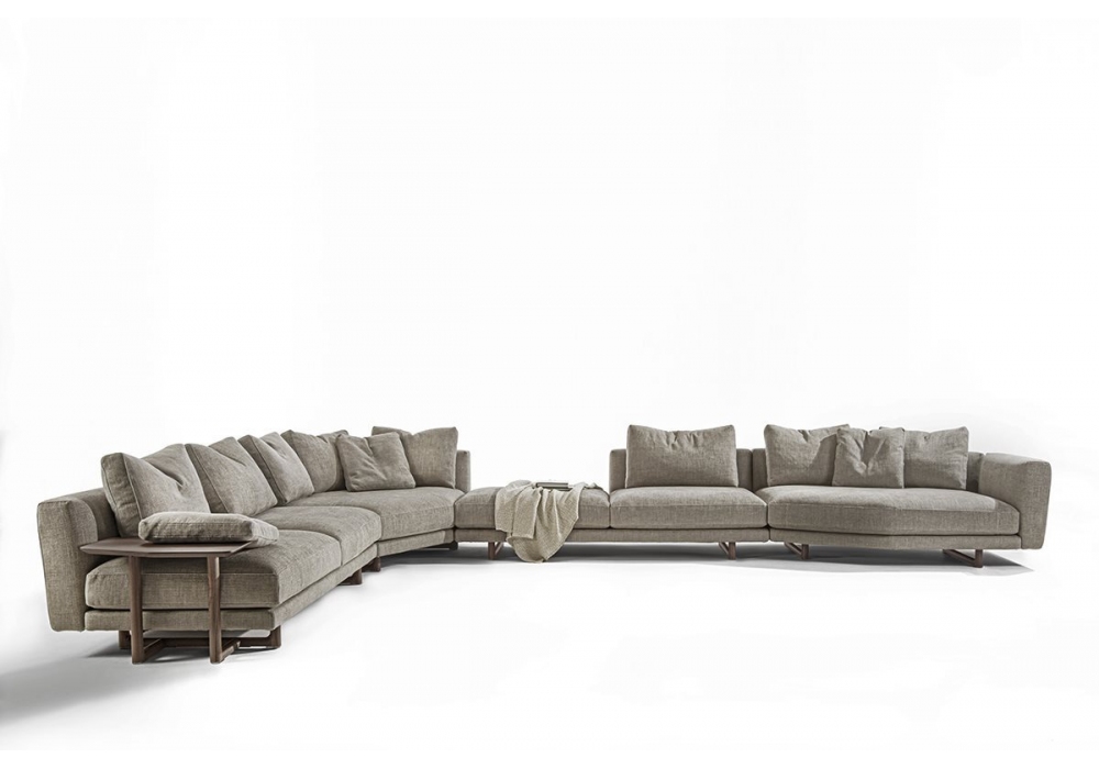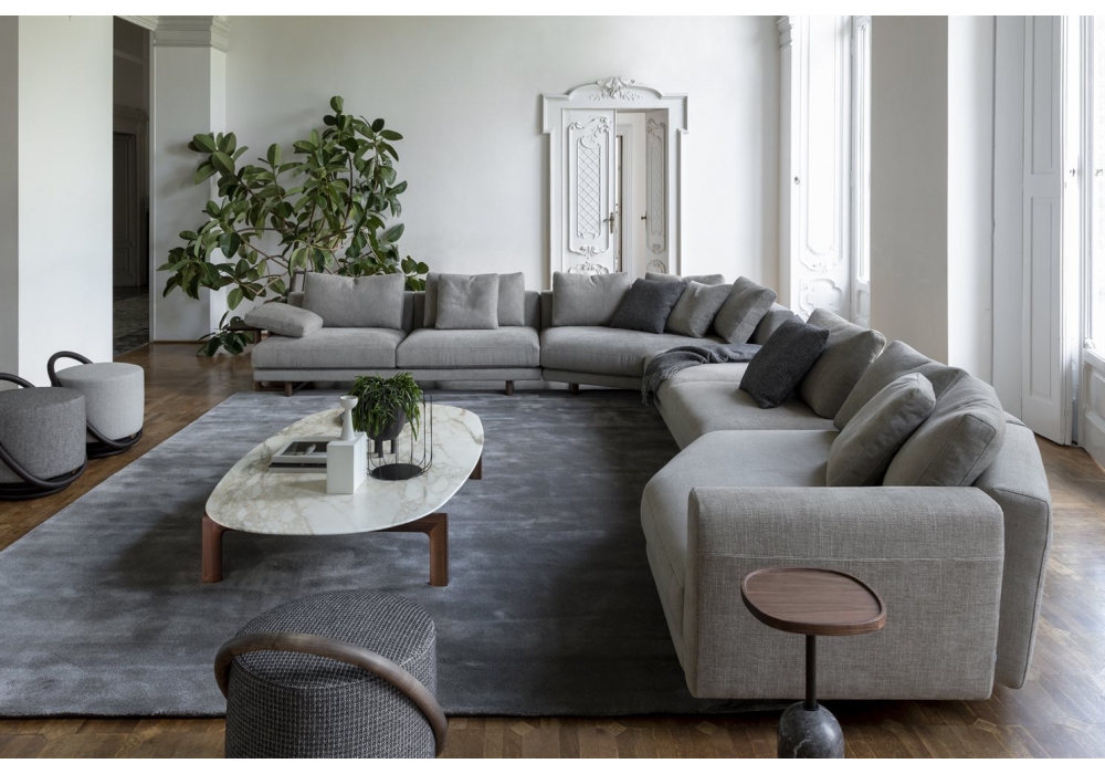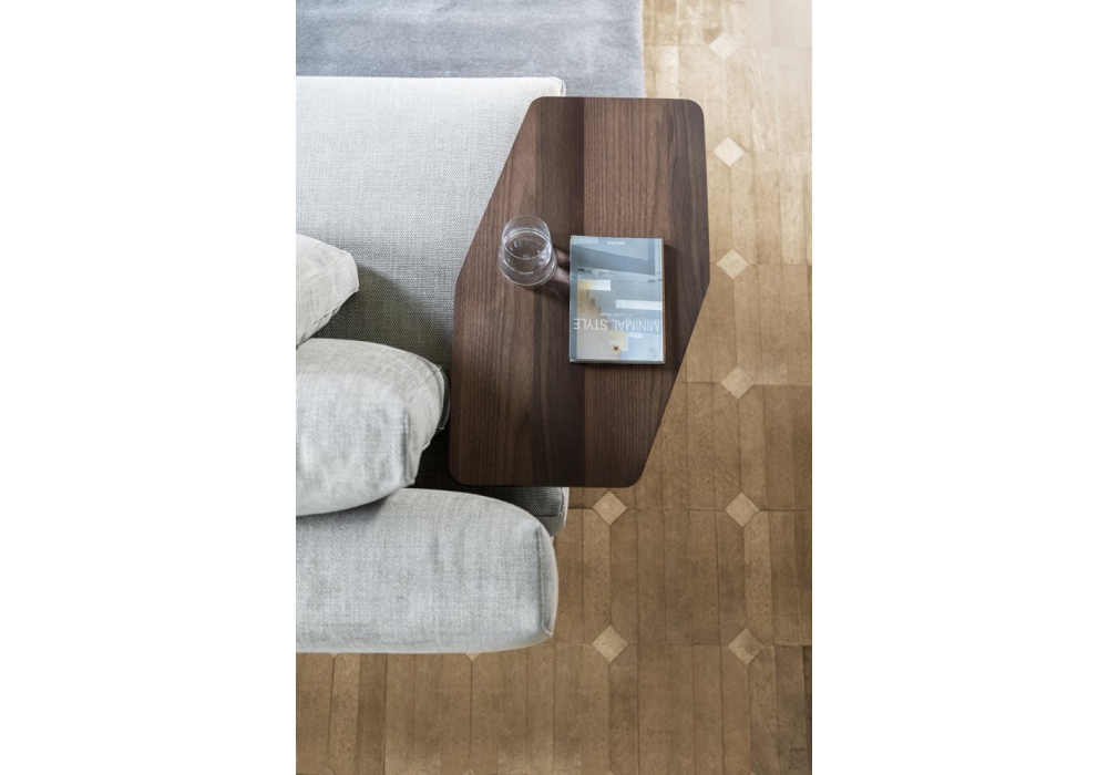 Abacus diseñado por Gabriele y Oscar Buratti para Porada es un sofá modular con base en nogal canaletta macizo y puntas en cromo negro y latón cepillado. Tapicería en tela o cuero. Los reposabrazos pueden acolcharse o con una función integrada de mesa de centro en nogal canaletta macizo.