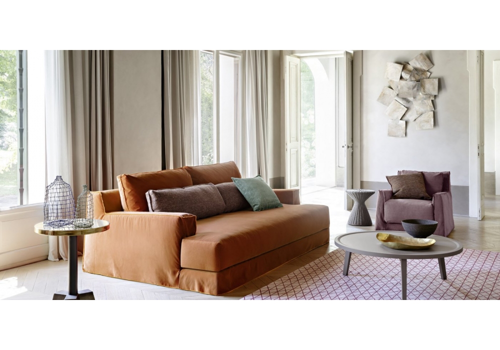 Loll diseñado por Paola Navone para Gervasoni es un sofá con acolchado en espuma de poliuretano. Cojines de asiento y respaldo en mixto plumón, fundas desenfundables en diferentes acabados.
