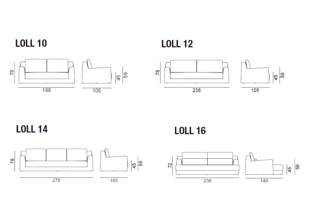 | Dimensiones | Loll 10_ 198 x 105 x H 78 cm; Loll 12_ 238 x 105 x H 78 cm; Loll 14_ 278 x 105 x H 78 cm; Loll 16_ 238 x 140 x H 72 cm; |